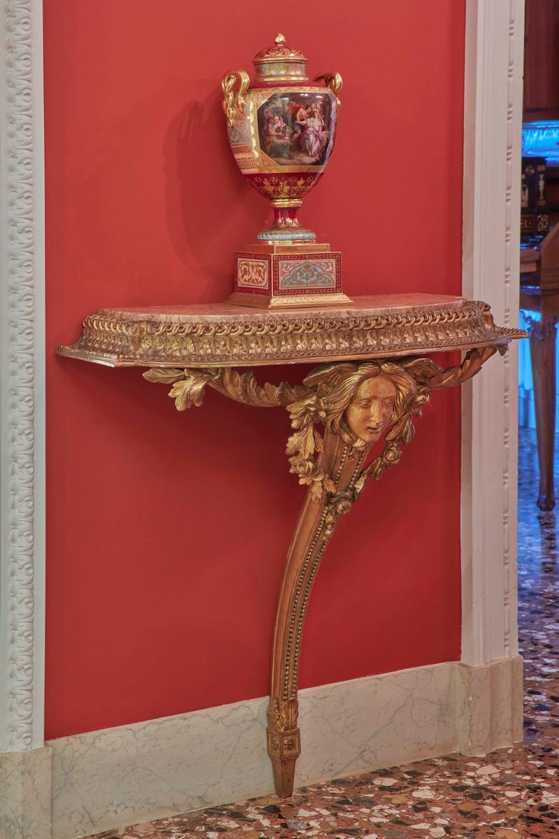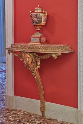 Fascia riccamente intagliata a motivo concatenato e foglie d'alloro. Gamba centrale scolpita all'attacco a mascherone tra volute di foglie e fiori. Piano sagomato in marmo