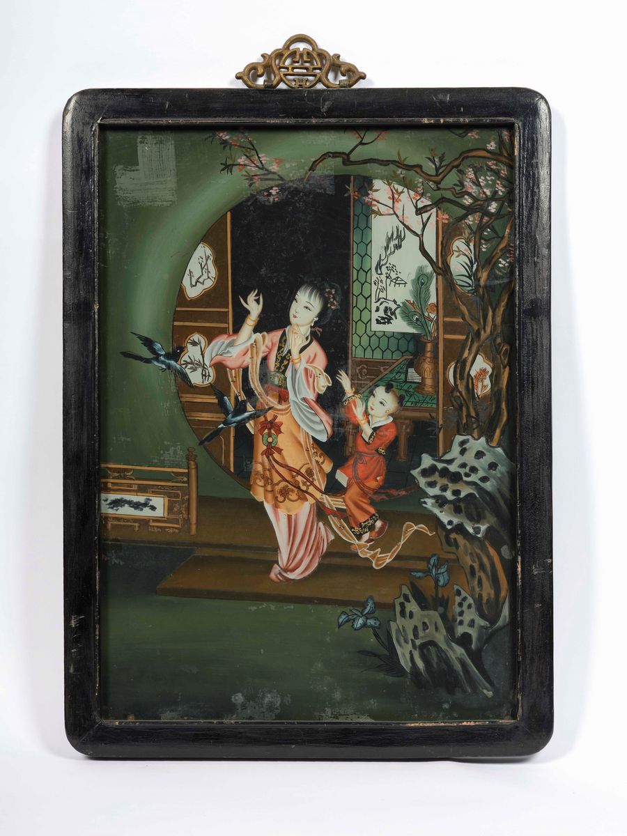 Coppia di dipinti su vetro raffiguranti episodi della vita di una Geisha, Giappone, periodo Meiji (1868-1912)