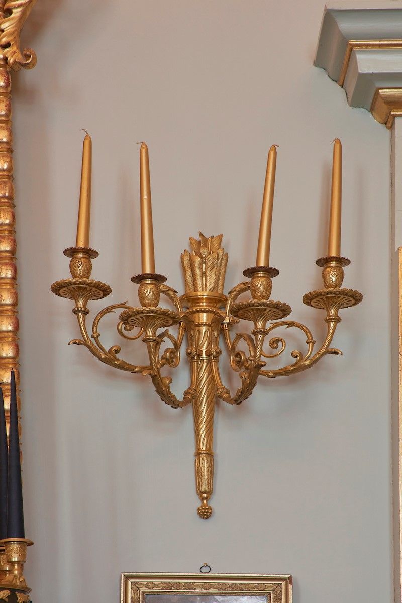 Coppia di grandi appliques in bronzo dorato al mercurio e cesellato. Francia inizio XIX secolo