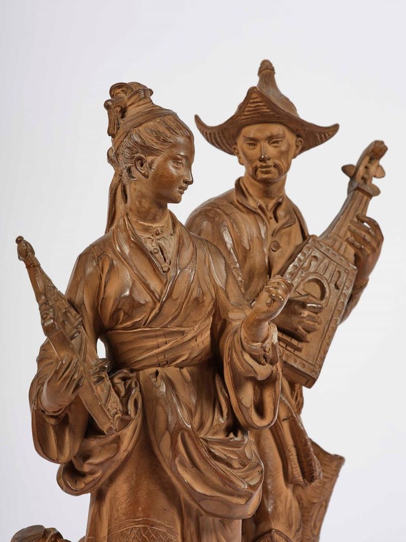 Coppia di musici in vesti di cinesi. Creta finemente modellata. Plasticatore del XVIII secolo