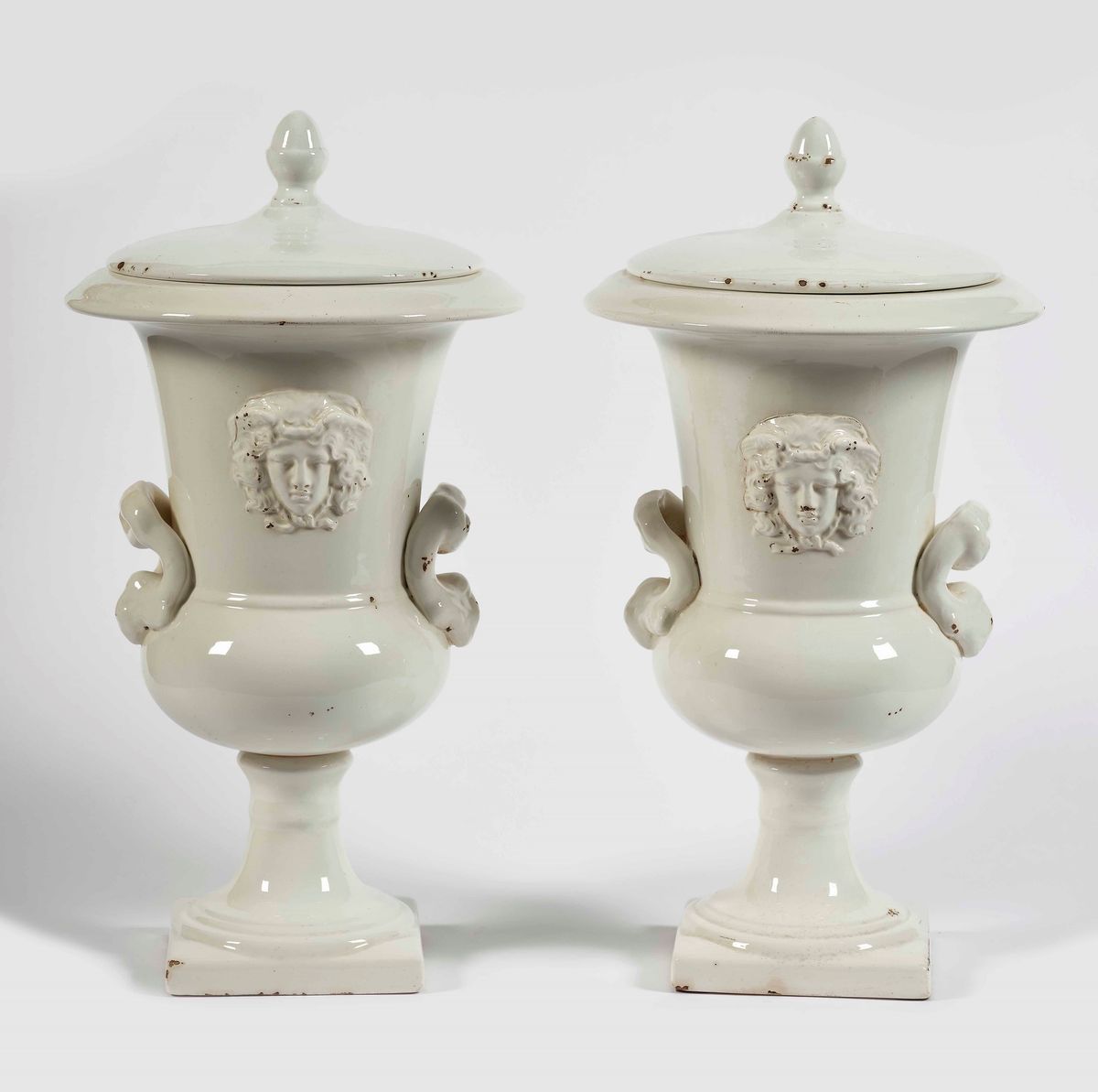 Vasi “Medici” in terraglia bianca su alto piede con due mascheroni a rilievo, doppia ansa a rocaille e coperchio con presa a pigna