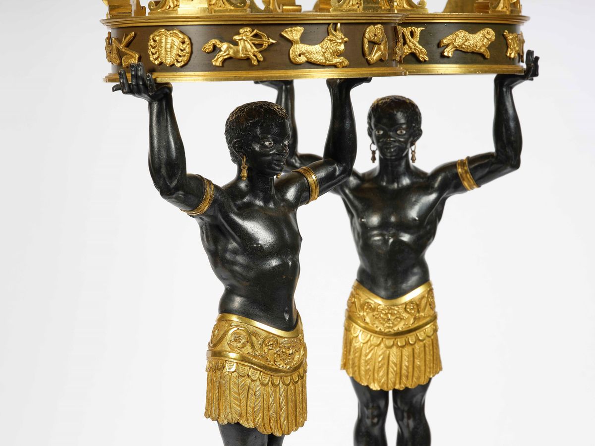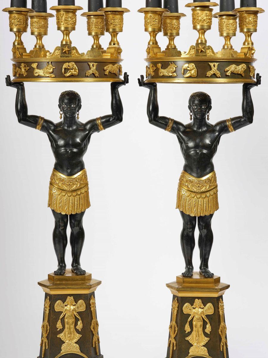 Importante coppia di candelabri in bronzo dorato e patinato "au bon sauvage". Manifattura di Luigi Manfredini (Bologna 1771, Milano 1840)