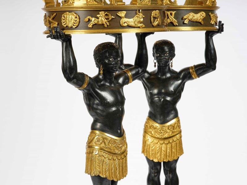 Composti da due mori nell'atto di sorreggere le cinque fiamme. Base poligonale poggiante su piedi ferini.