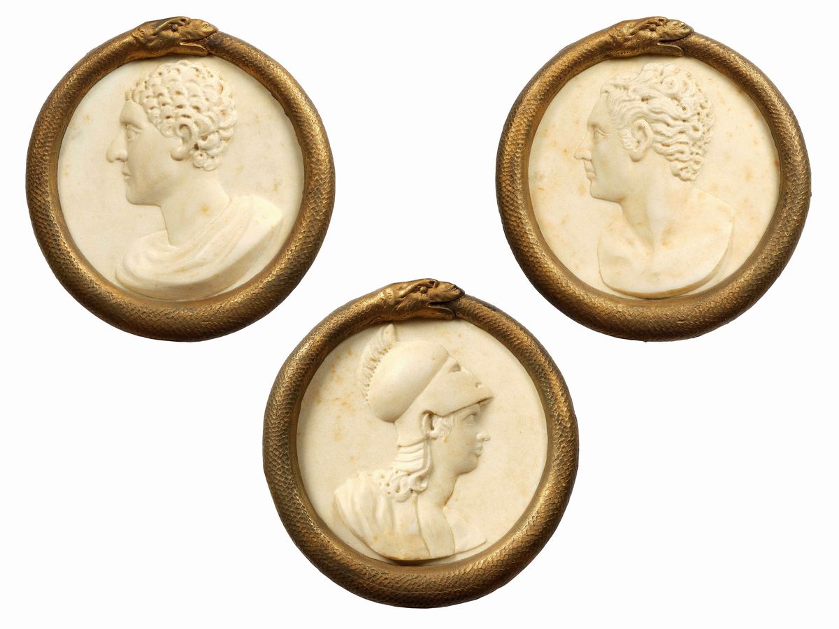 Insieme di sei rilievi rotondi con profili classici. Marmo bianco. Arte neoclassica del XIX secolo