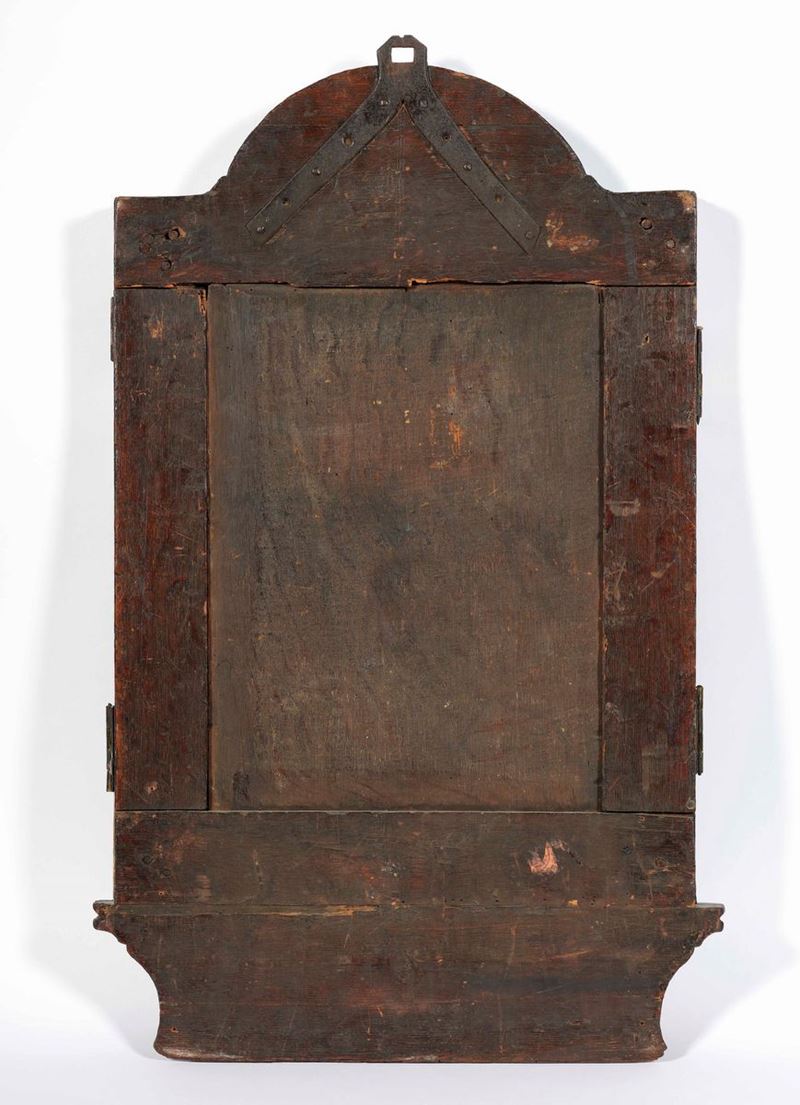 Scuola fiamminga del XVI secolo Trittico a tre ante richiudibili raffigurante gentiluomo nello studio e Crocifissione con [..]