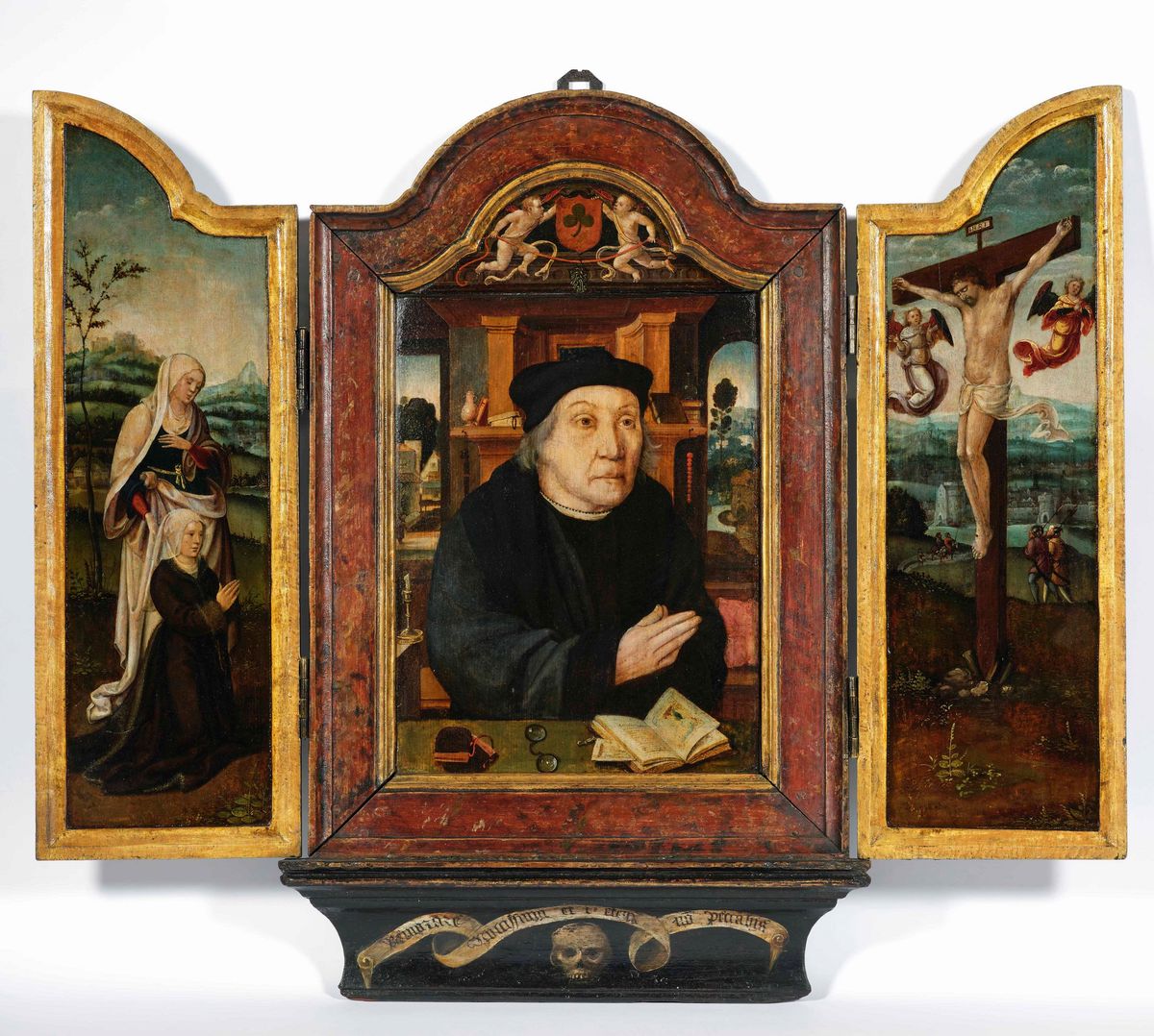 Scuola fiamminga del XVI secolo Trittico a tre ante richiudibili raffigurante gentiluomo nello studio e Crocifissione con ritratto di committente