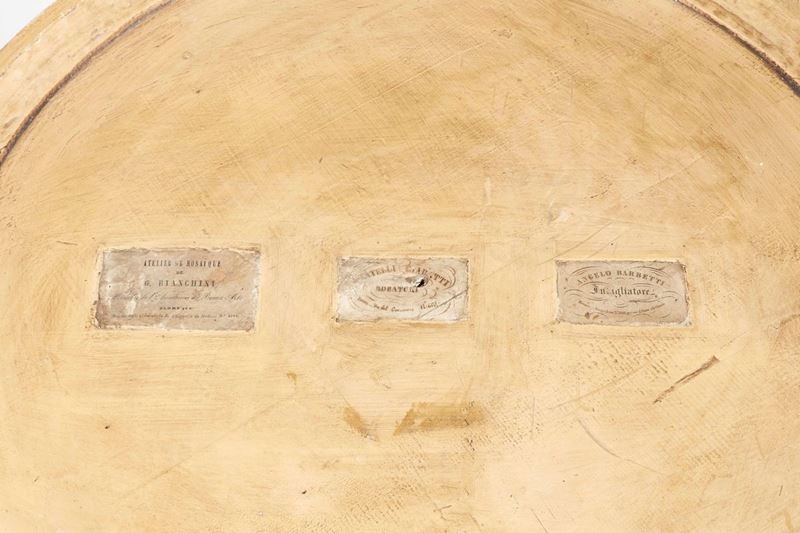 Sotto il piano etichetta cartacee dell'Atelier de mosaique de G.Bianchini, Firenze; etichetta cartacea dei Fratelli Gia(ba?)tti doratori di Firenze e etichetta di Angelo Barbetti intagliatore di Firenze