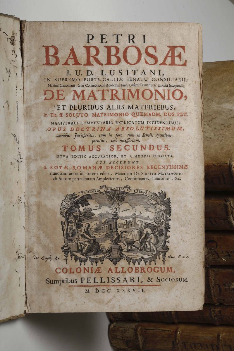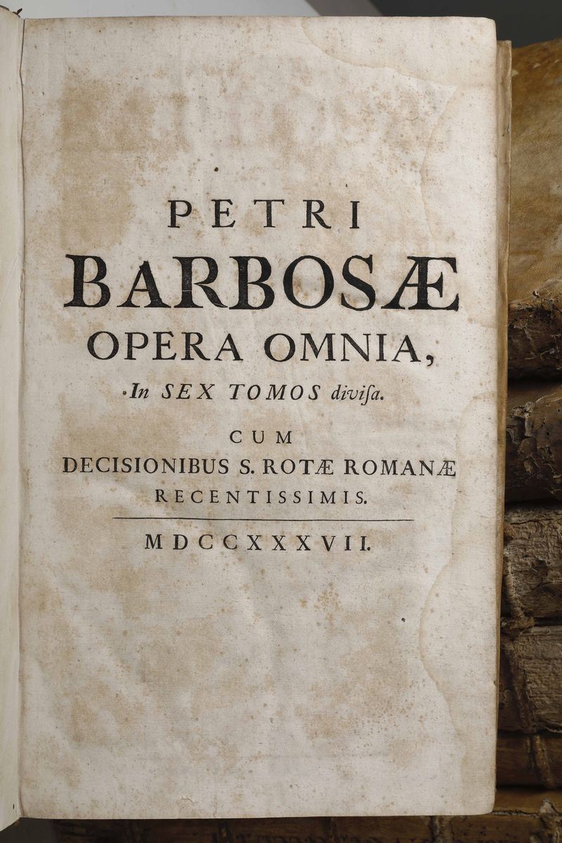 In-folio. Legature coeve in pergamena rigida. Bruniture e altri difetti e mancanze. Si aggiungono altri 18 volumi contenenti opere giuridiche dello stesso autore.