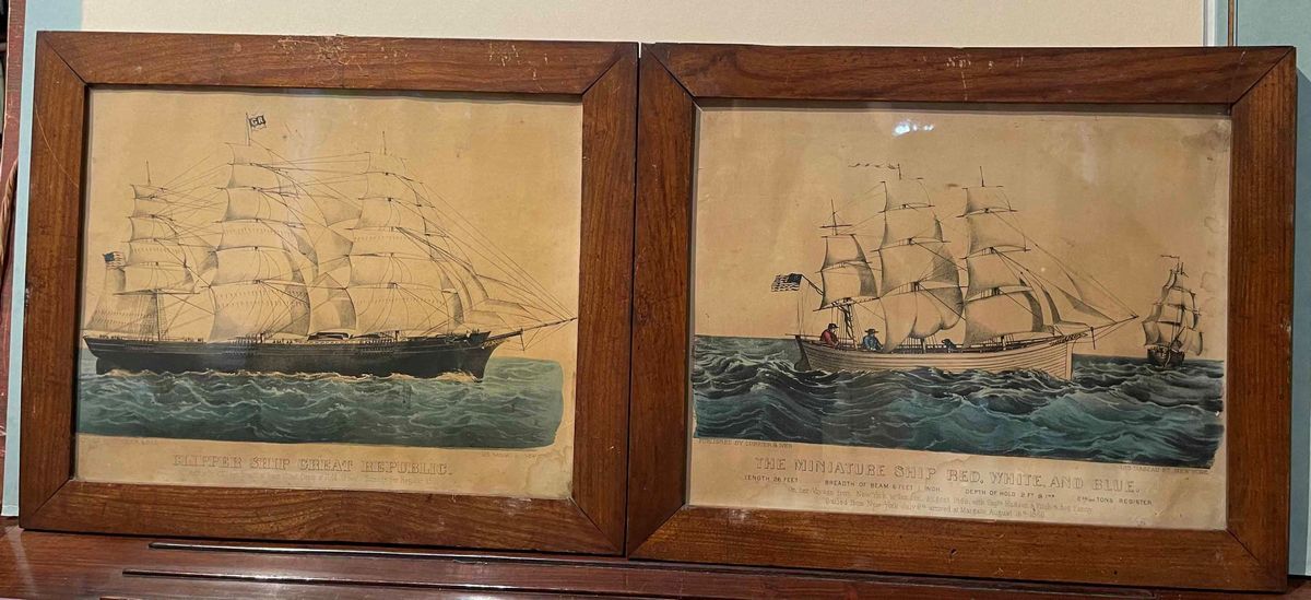 Currier & Ives, litografia colorata entro cornice Due velieri