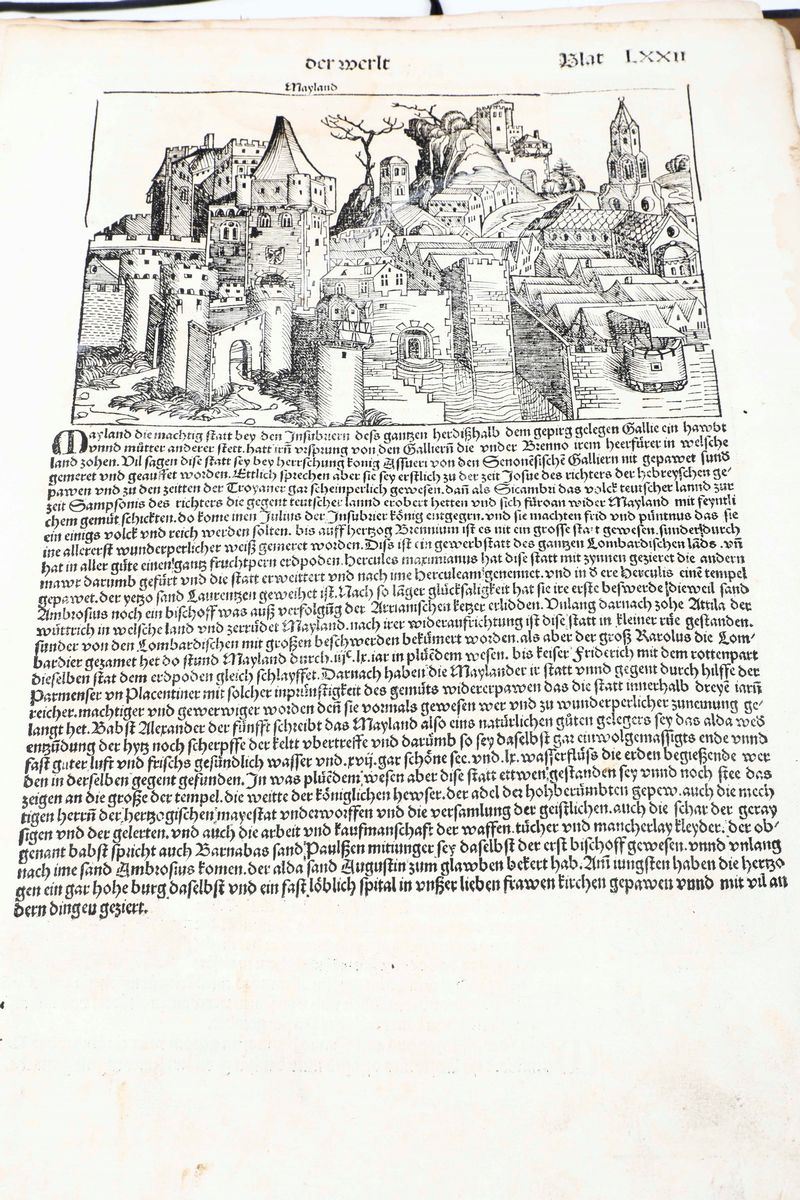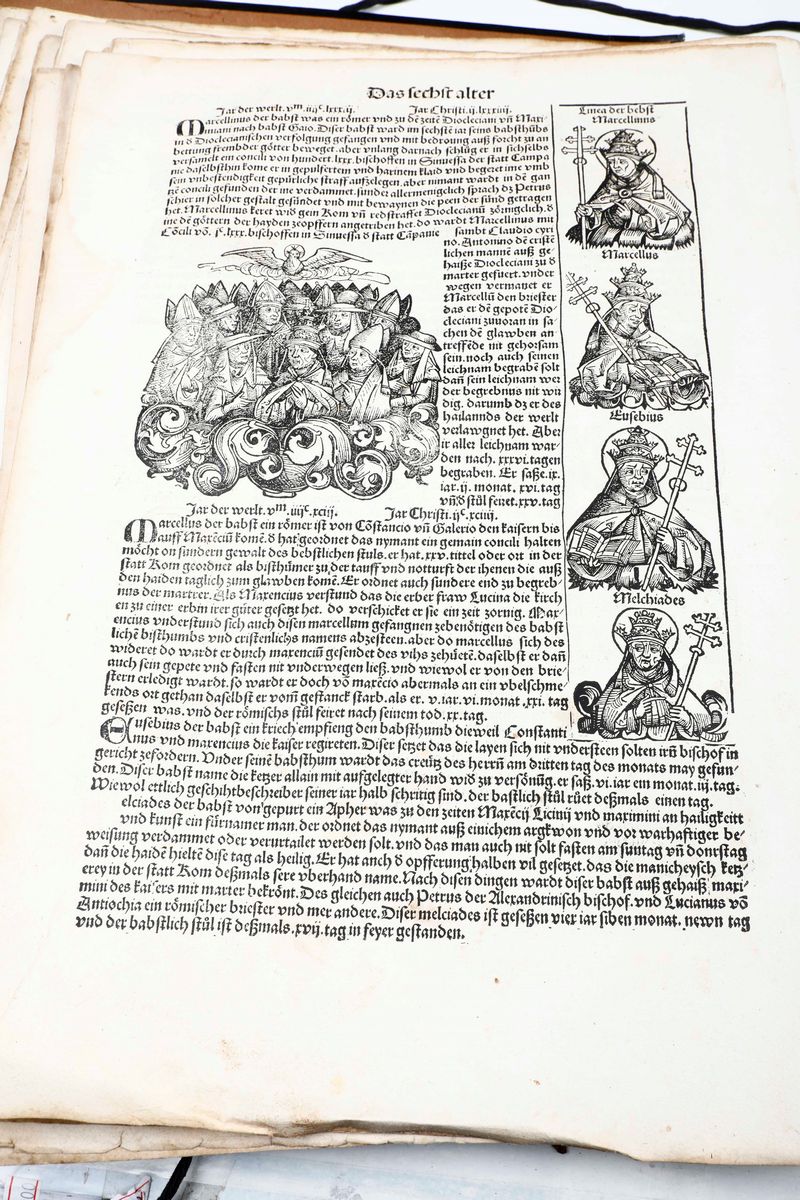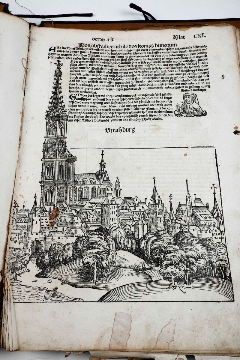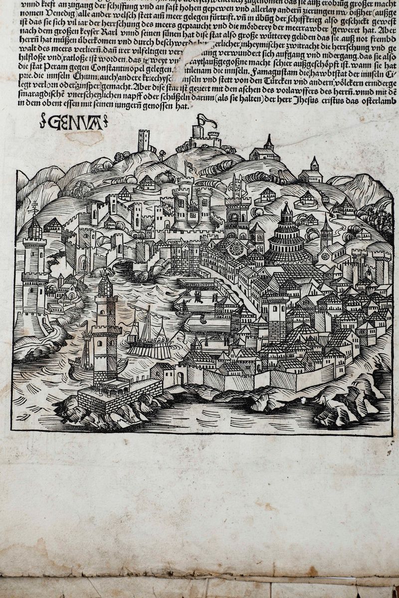 In-folio. Raccolta di 135 fogli, presumibilmente provenienti da edizione del 1493. Alcune parti ritagliate, difetti e mancanze. Presenti alcune grandi vedute di città tra cui Roma, Genova, Ravenna e Gerusalemme. Conservato entro cartellina d'archivio del secolo XX. Venduto come raccolta di incisioni xilografiche.