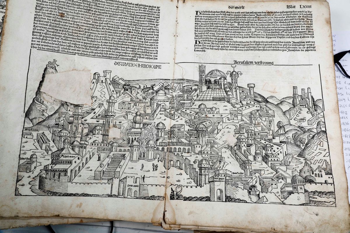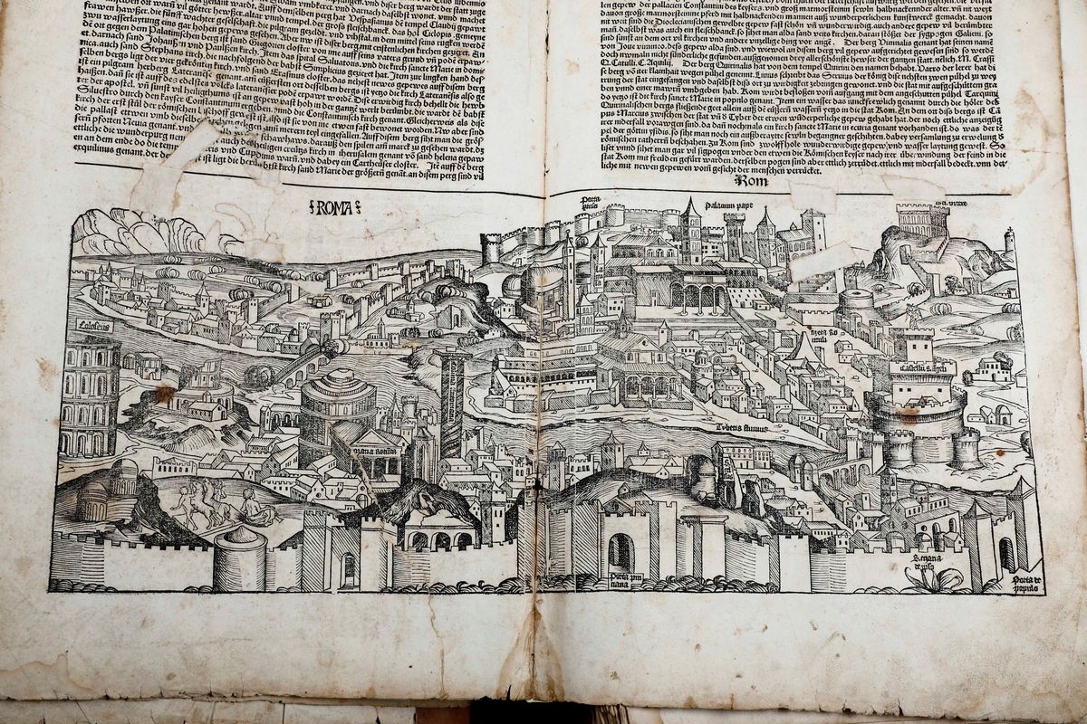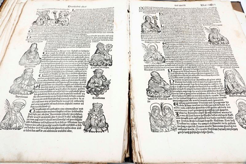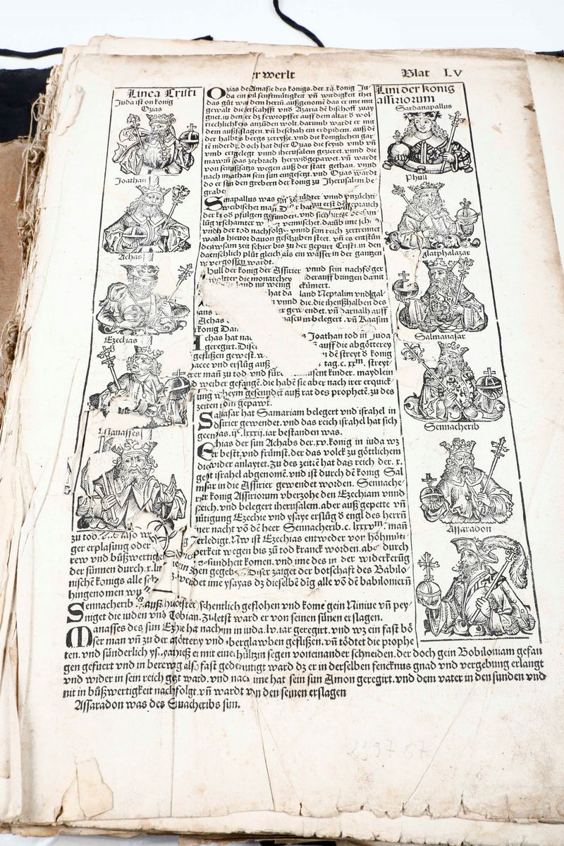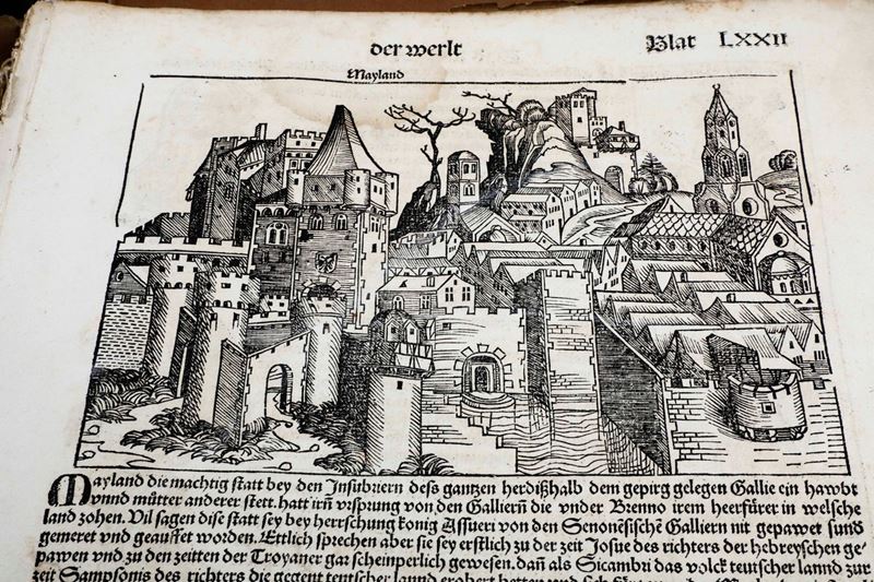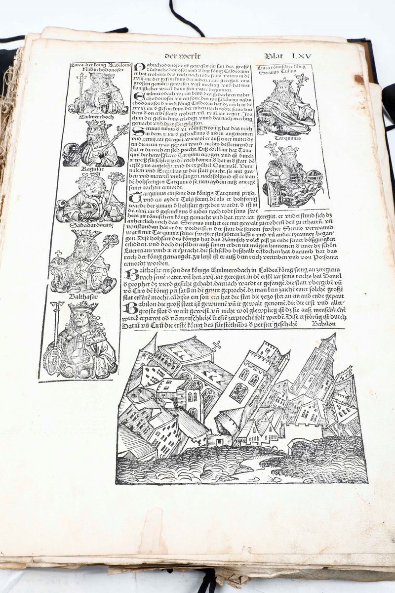 In-folio. Raccolta di 135 fogli, presumibilmente provenienti da edizione del 1493. Alcune parti ritagliate, difetti e mancanze. Presenti alcune grandi vedute di città tra cui Roma, Genova, Ravenna e Gerusalemme. Conservato entro cartellina d'archivio del secolo XX. Venduto come raccolta di incisioni xilografiche.