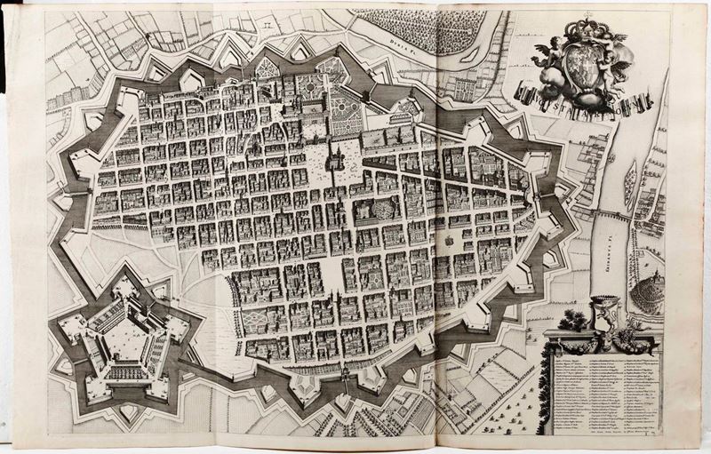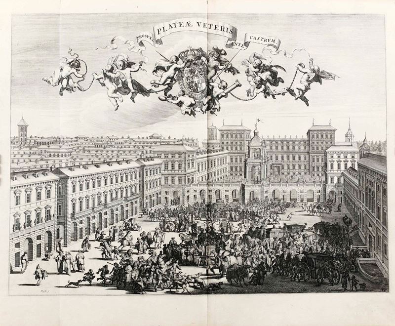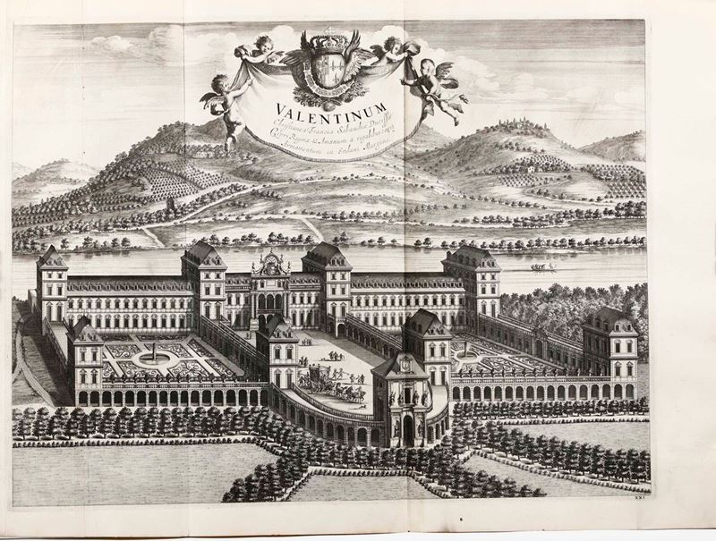 - (Tomo I) p. II "description et plans des palais et chateaux royals et des villes... Piemont, Suse e Saluces", antiporta incisa uguale alla precendente, pp. (102).