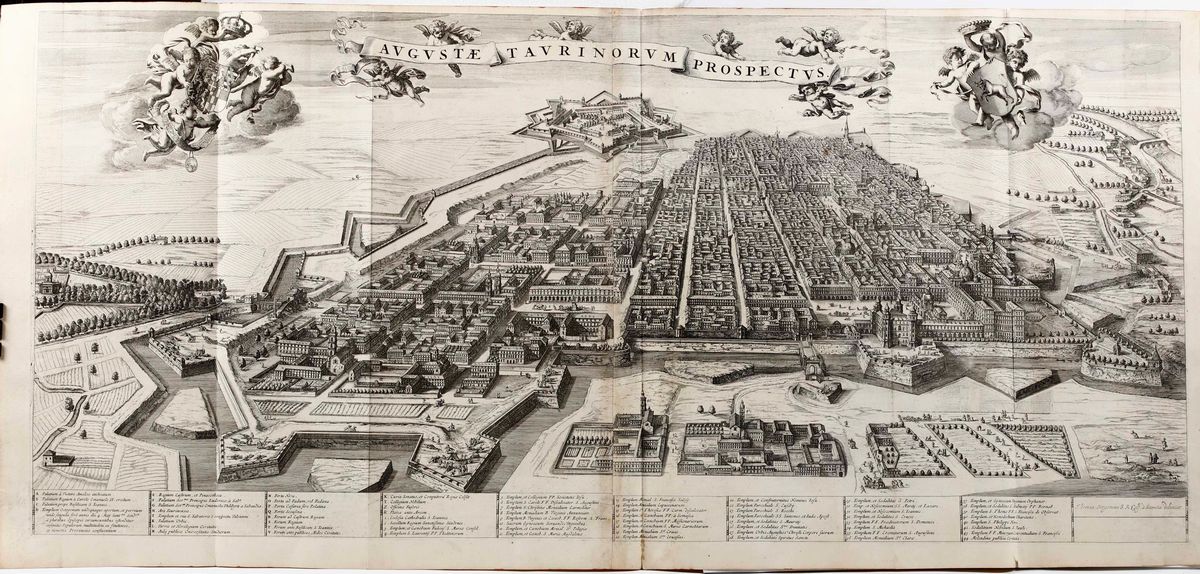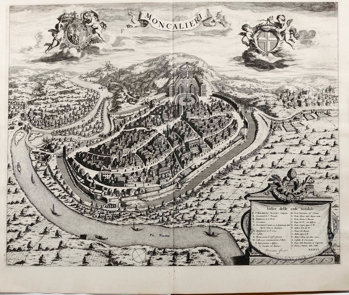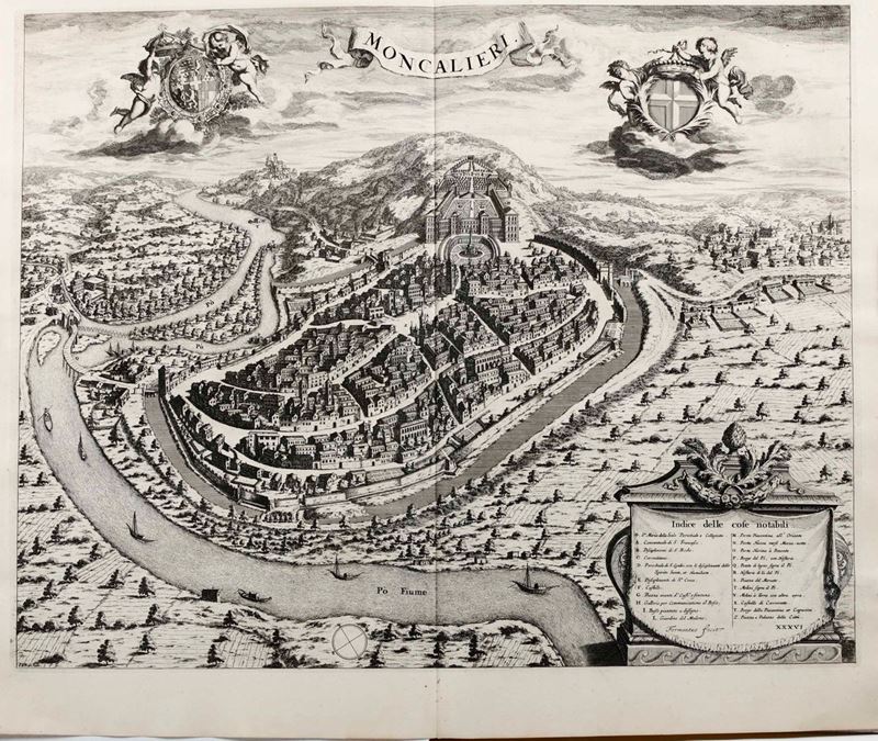 - (Tomo I) parte I "description gèographique du Pièmont, l'histoire de la Maison de Savoie et la description de la ville de Turin....", antiporta incisa con la raffigurazione del Piemonte, pp. (4), 96, (38).