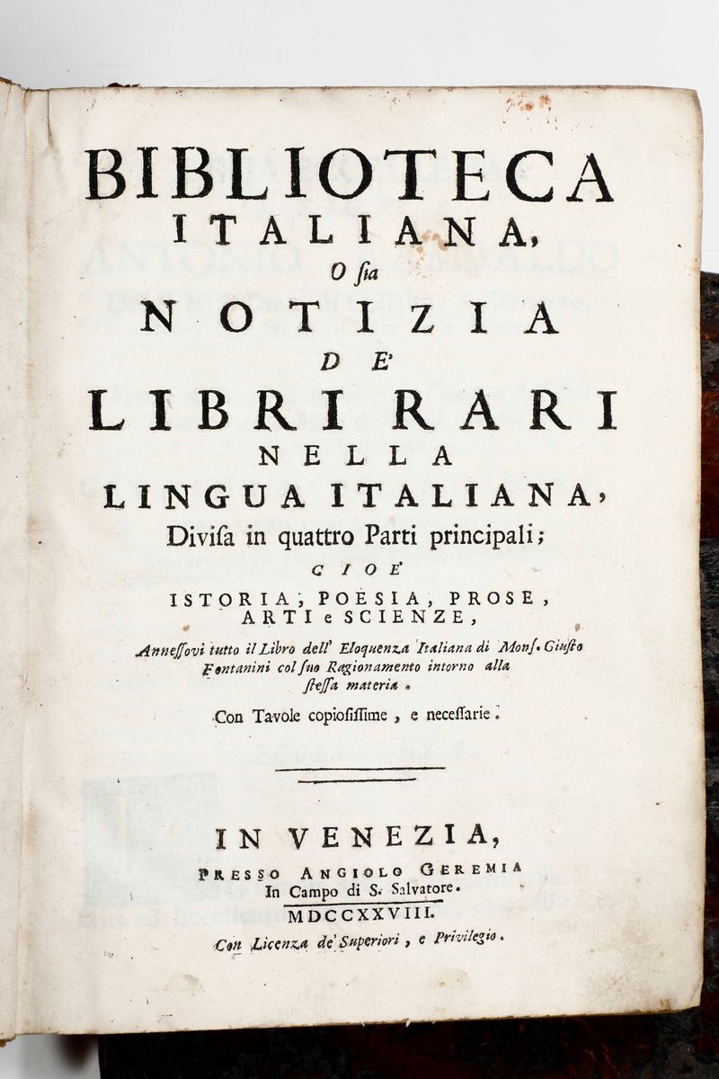 Haym Nicola Francesco Biblioteca Italiana o sia Notizia de Libri Rari nella lingua italiana... In Venezia presso Angiolo Geremia 1728