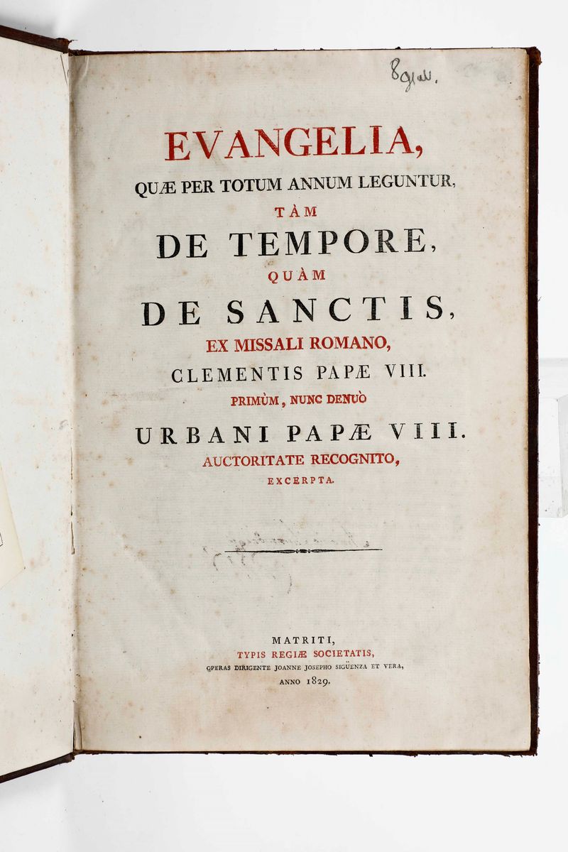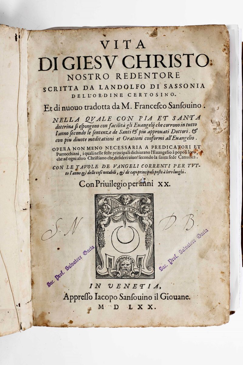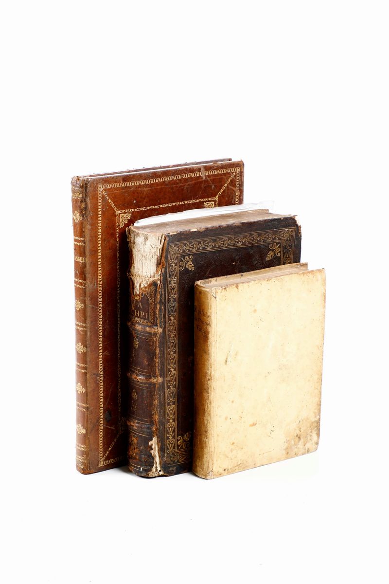 In-4°. Legatura coeva in pergamena rigida. Buon esemplare con belle figure xilografiche. (Si uniscono nel lotto:) Landolfo di Sassonia, Vite di Gesù Cristo, Venezia Sansovino 1770. Illustrato. Bella rilegatura antica che presenta mancanze e difetti. Evangelia que per totum annum legentur, Matriti, Typis eregia societate, 1829.