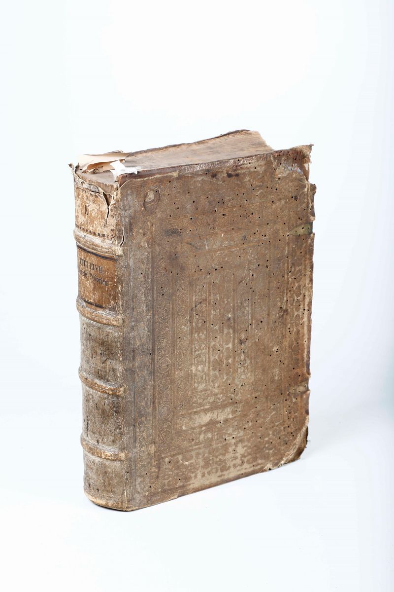 In-folio. Rilegatura coeva in piena pergamena con ricche decorazioni a secco ai piatti. Ex libris a timbro. Frontespizio stampato in rosso e nero. Bella edizione illustrata da centinaia di xilografie. Bruniture ed altri difetti. Mancanze alla rilegatura.