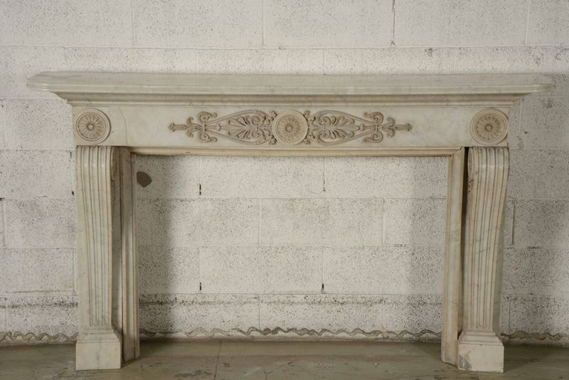 Fascia con rosone centrale e due alle estremità, montanti scanalati scolpiti a ricciolo