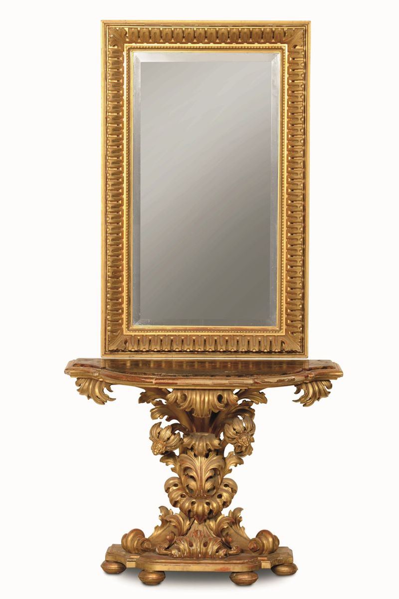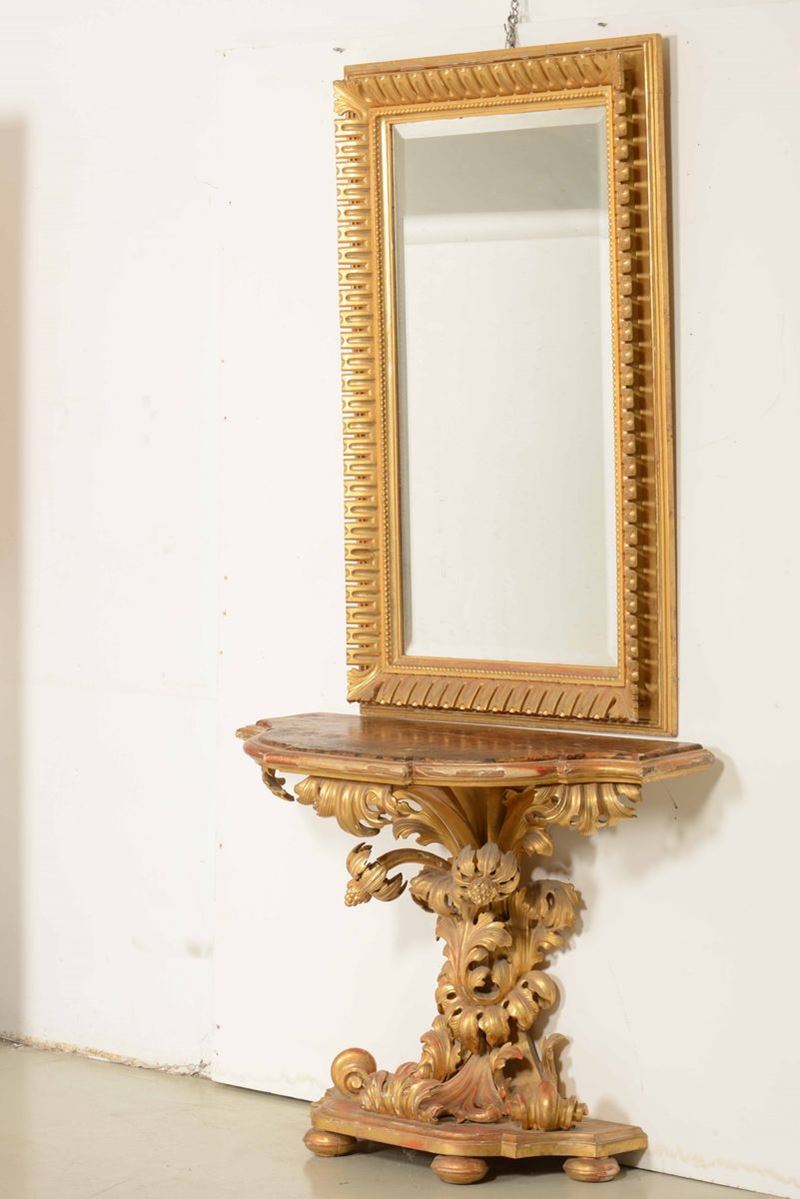 Consolle scolpita a motivi vegetali, piano sagomato e laccato. Del lotto fa parte una specchiera rettangolare intagliata e modanata, con profilo interno a perlinature.
