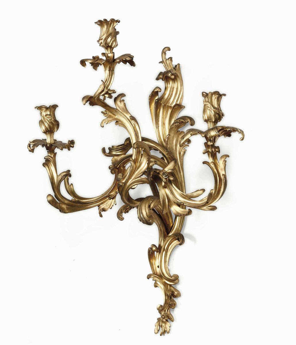 Coppia di grandi appliques a tre fiamme in bronzo dorato. Francia probabile XVIII secolo