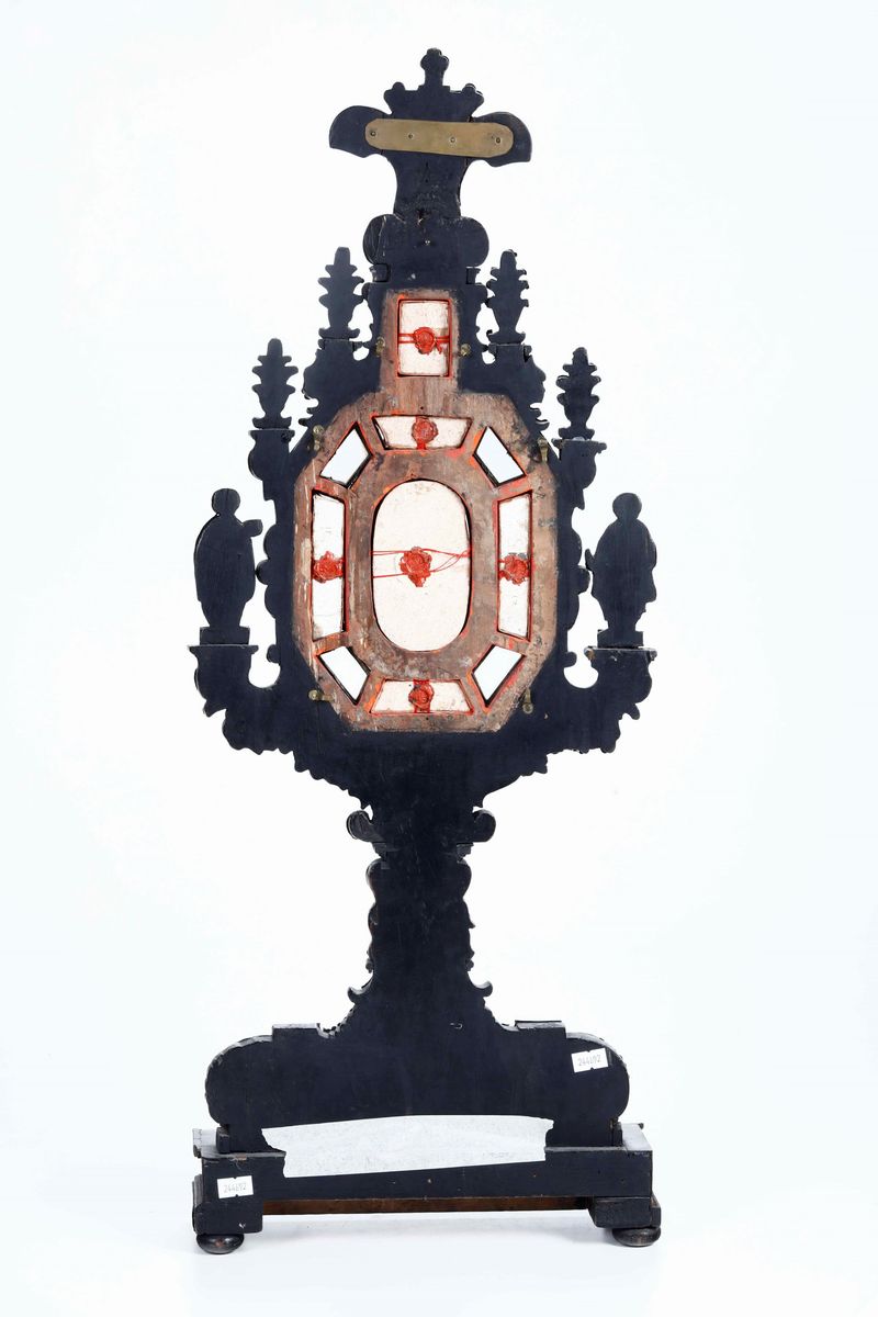 Importante reliquiario a tabella. Ebano e altre essenze lignee, cristallo di rocca molato, argento fuso e cesellato. Marchio [..]