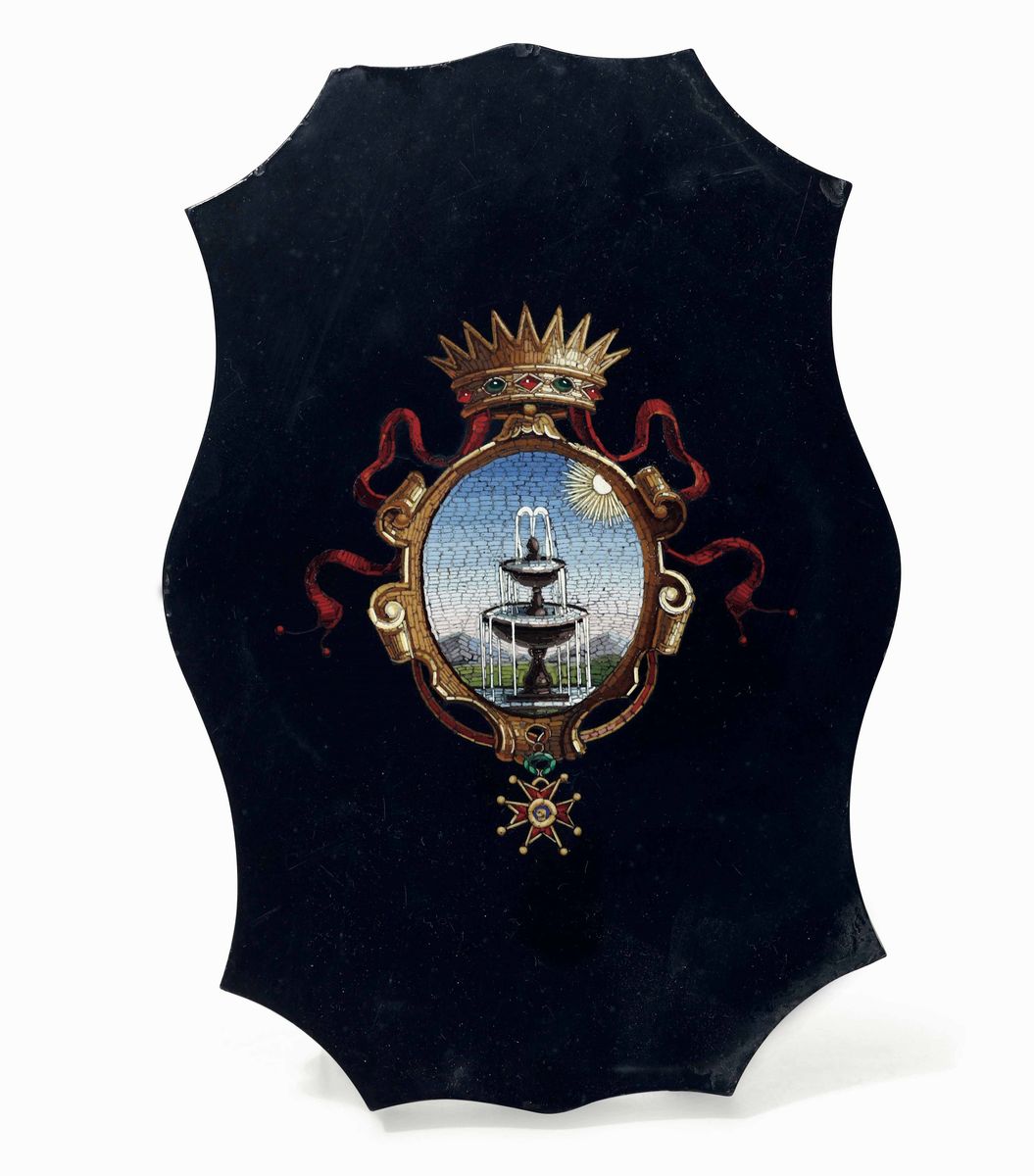 Micromosaico raffigurante stemma coronato con fontana su supporto in marmo nero del Belgio. Italia XIX secolo