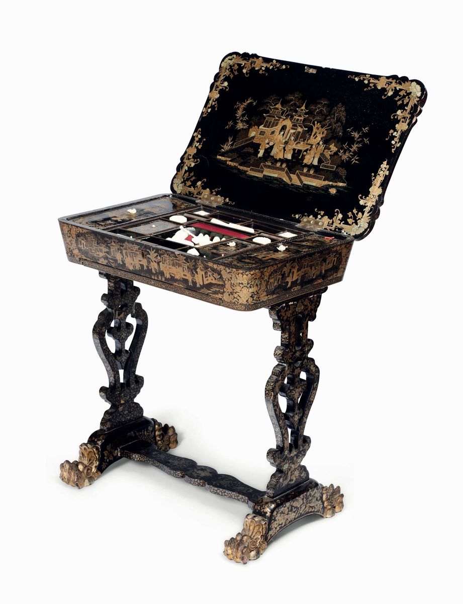 Tavolino da lavoro in legno ebanizzato e decorato a cineserie. XIX secolo