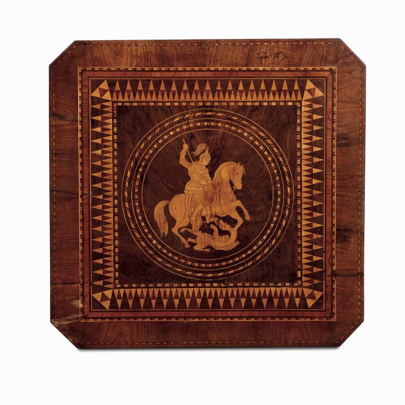 Piano quadrangolare centrato da San Giorgio e il drago entro riserva circolare, fascia con cassetto, gamba tornita terminante su tre piedi a voluta