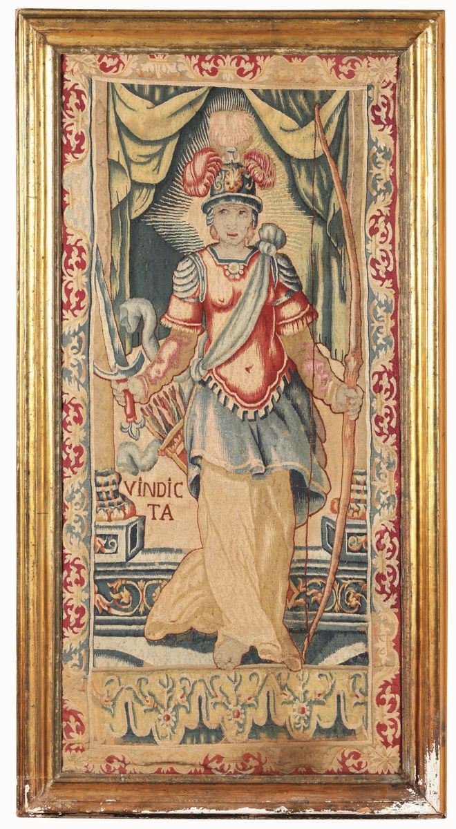 Two fragments of tapestry, depicting "Confidence" and "Revenge", 18th century. 118x60cm and 122x58cm