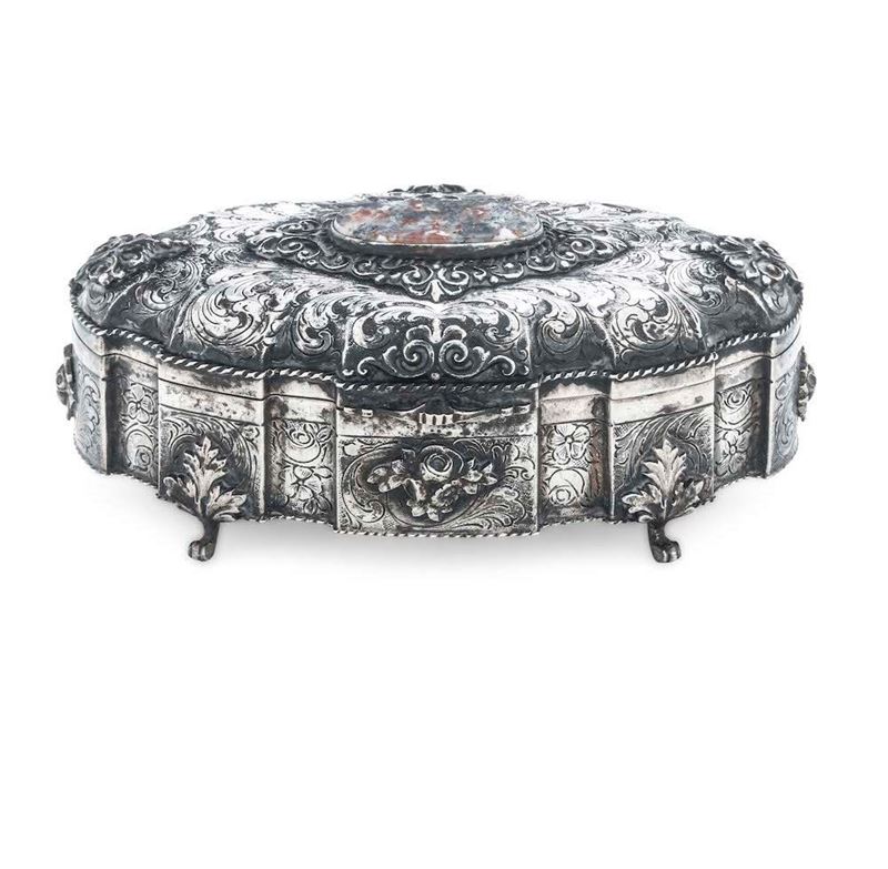 Cofanetto portgioie in argento fuso,cesellato e castone con agata muschiata. Argenteria artistica italiana del XX secolo