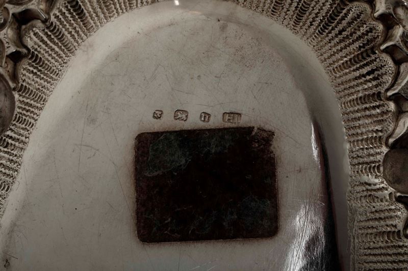 Coppia di vassoi in argento sterling fuso e cesellato. Londra 1928, argentiere H.I. (non identificato)