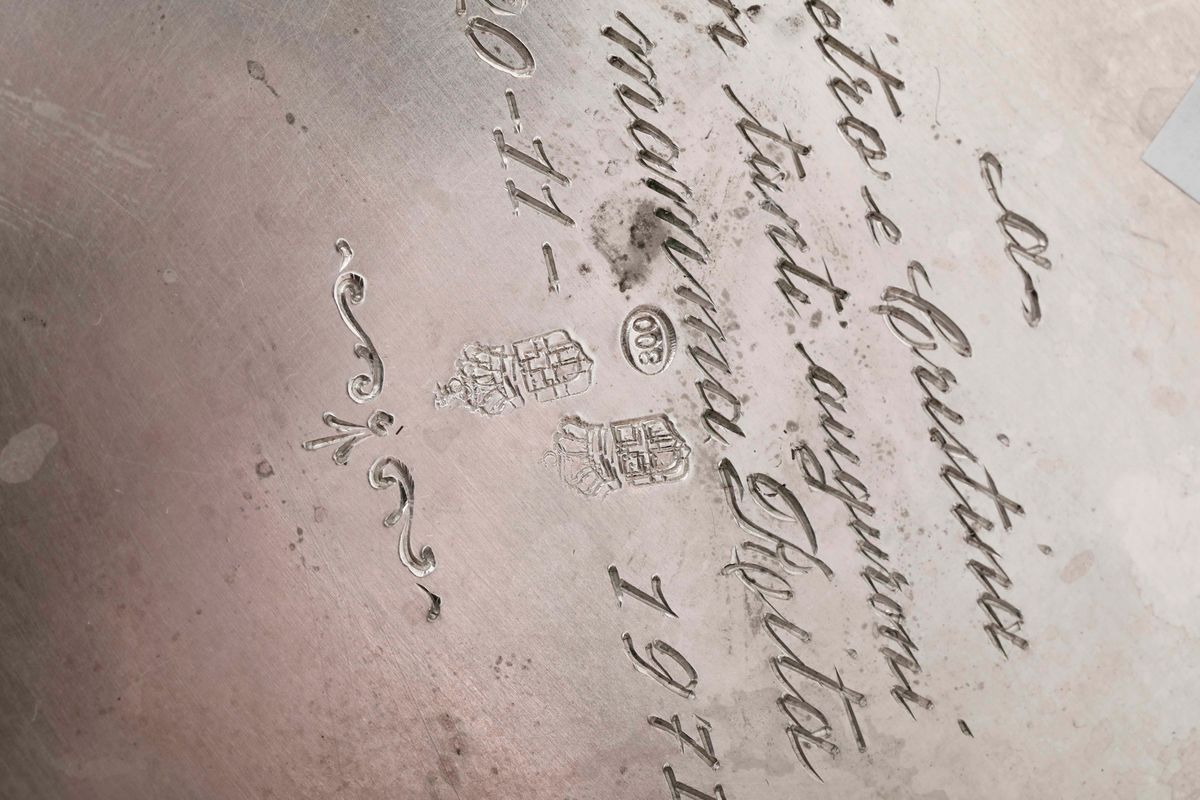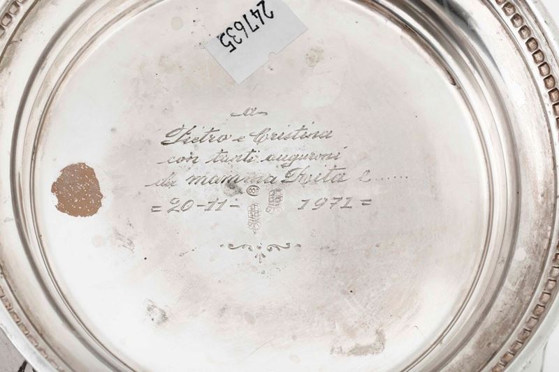 Corpo inciso e sbalzato a tralci d’uva, bordo a modanatura, base a perlinatura.