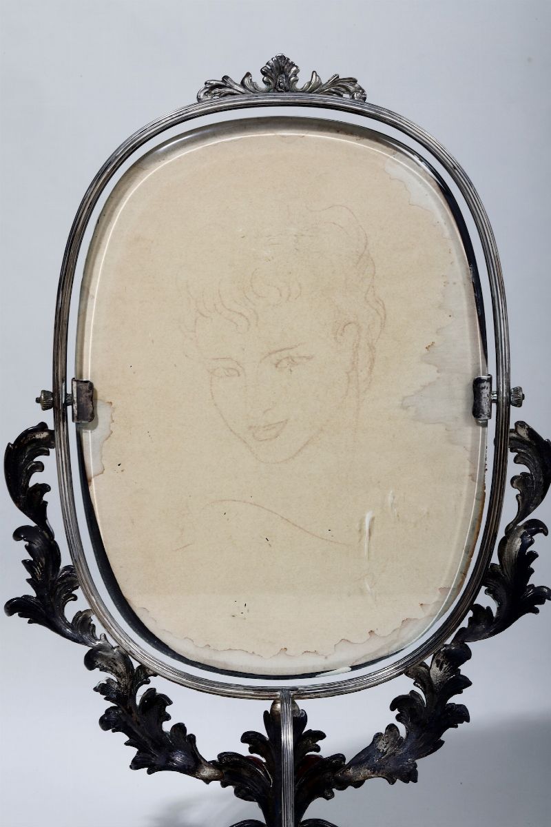 Specchio da toelette in argento e pietre dure. Argenteria artistica italiana della prima metà del XX secolo. Bollo con fascio littorio in uso dal 1935 al 1945. Argentiere Ghisoni & Maldifassi