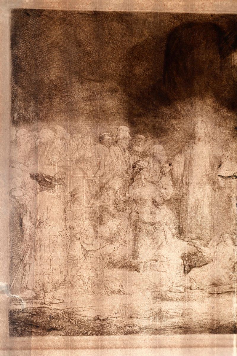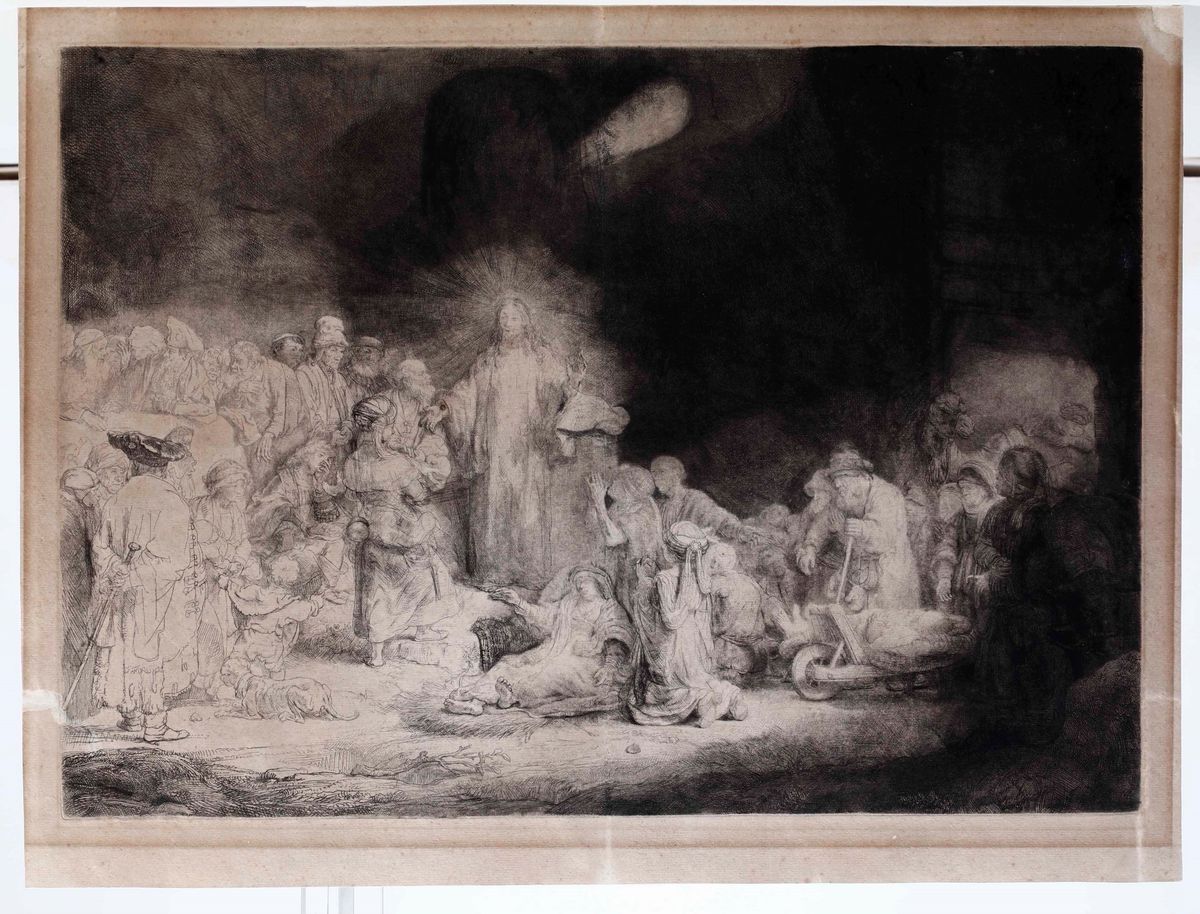 Capolavoro riconosciuto dell'arte incisoria internazionale, il soggetto di questo foglio è Gesù, nell'espletamento della sua funzione salvifica e guaritrice, assumendo come riferimento testuale privilegiato, il racconto del Vangelo di Matteo. Rembrandt, riunisce in una sola opera, diversi episodi della narrazione evangelica, e li mette in dialogo tra di loro. Il risultato è straordinario, e riesce ad esprimere attraverso il gioco della luce e del buio, con una impareggiabile padronanza della tecnica, la novità rivoluzionaria del messaggio di Cristo. La "Buona Novella" si rivela ai nostri occhi, con tutta la sua forza e novità, per chi la saprà accogliere...