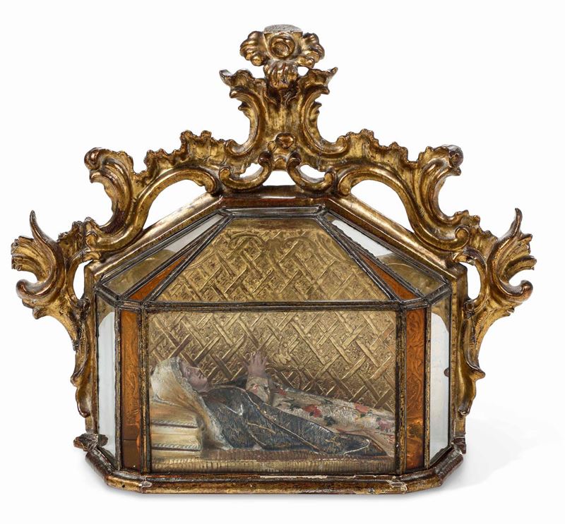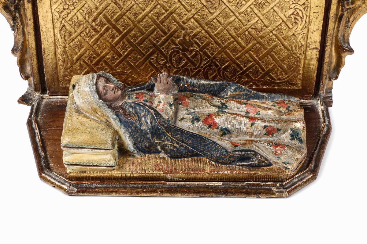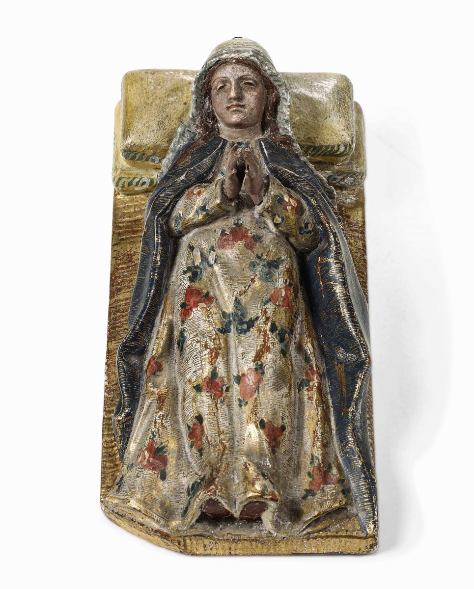 A wooden Dormitio Virginis in a wood and glass case, 1700s