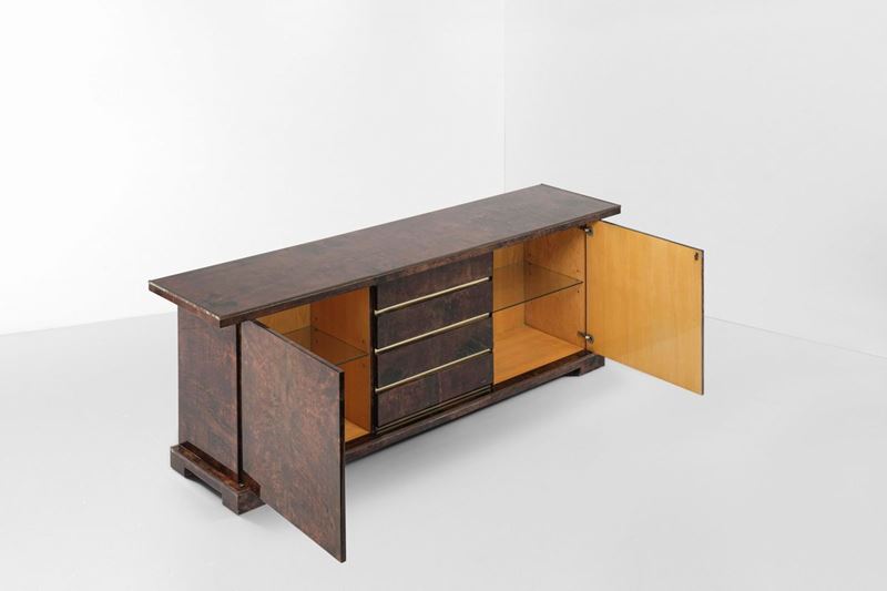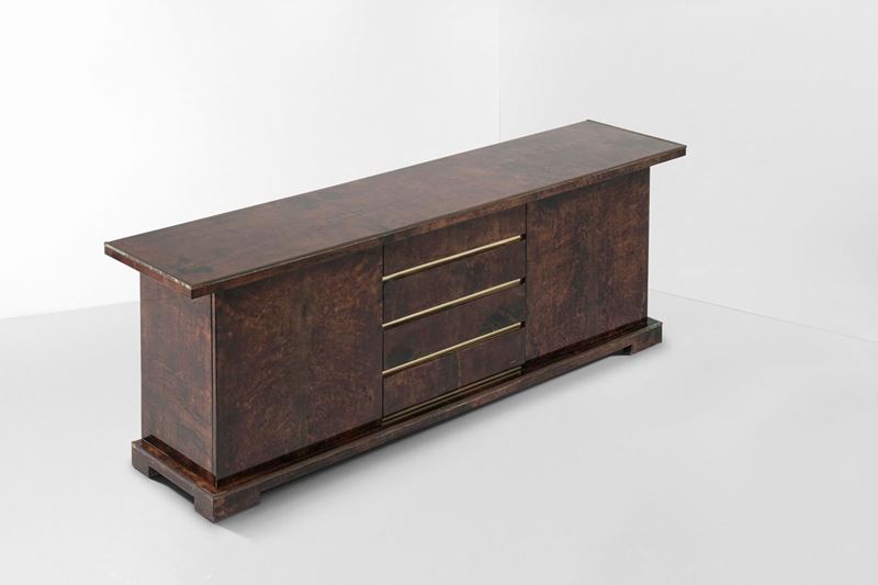 Grande mobile contenitore con struttura in legno e rivestimenti in pergamena.