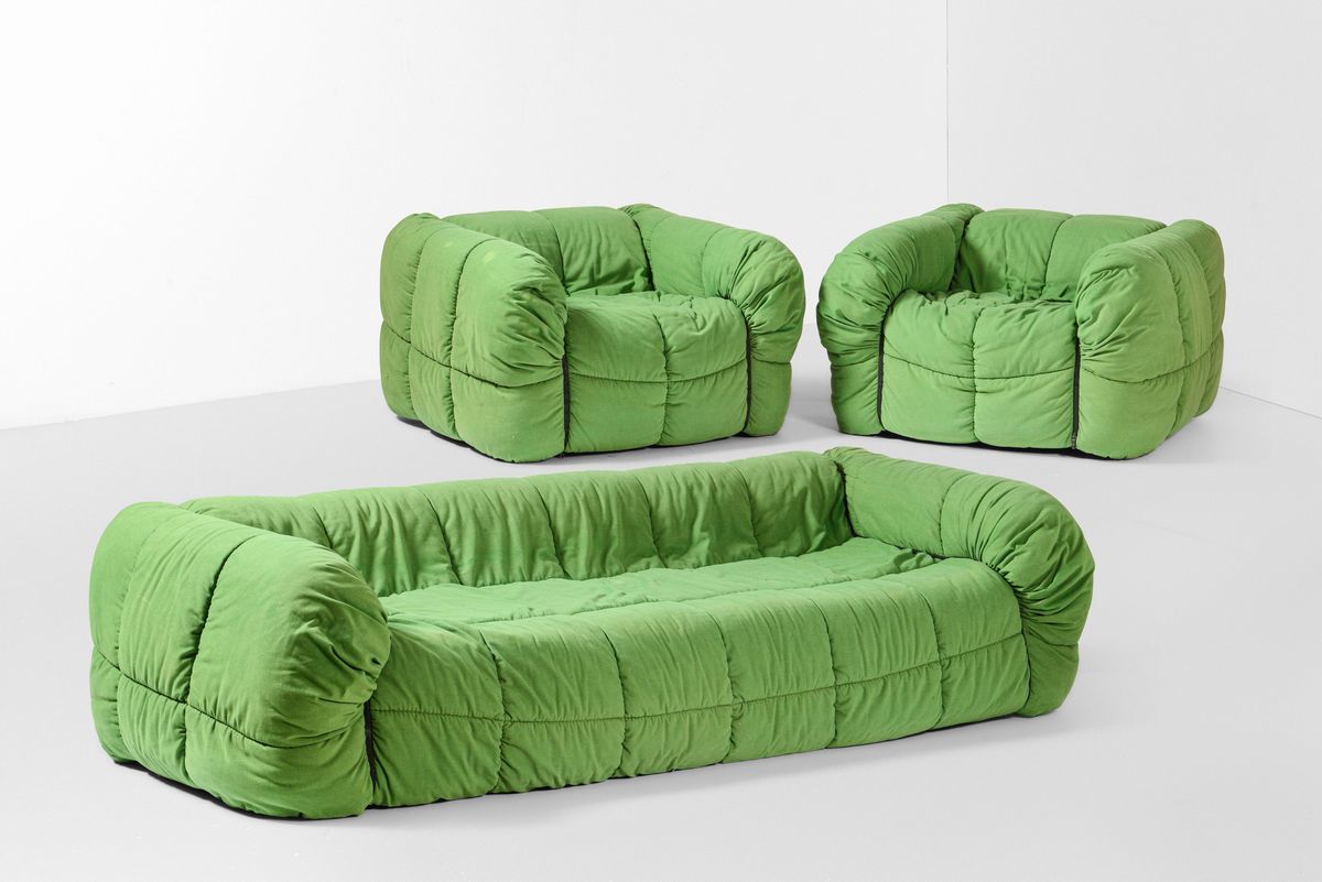Salotto composto da un divano e due poltrone in poliuretano espanso. Rivestimenti in tessuto.