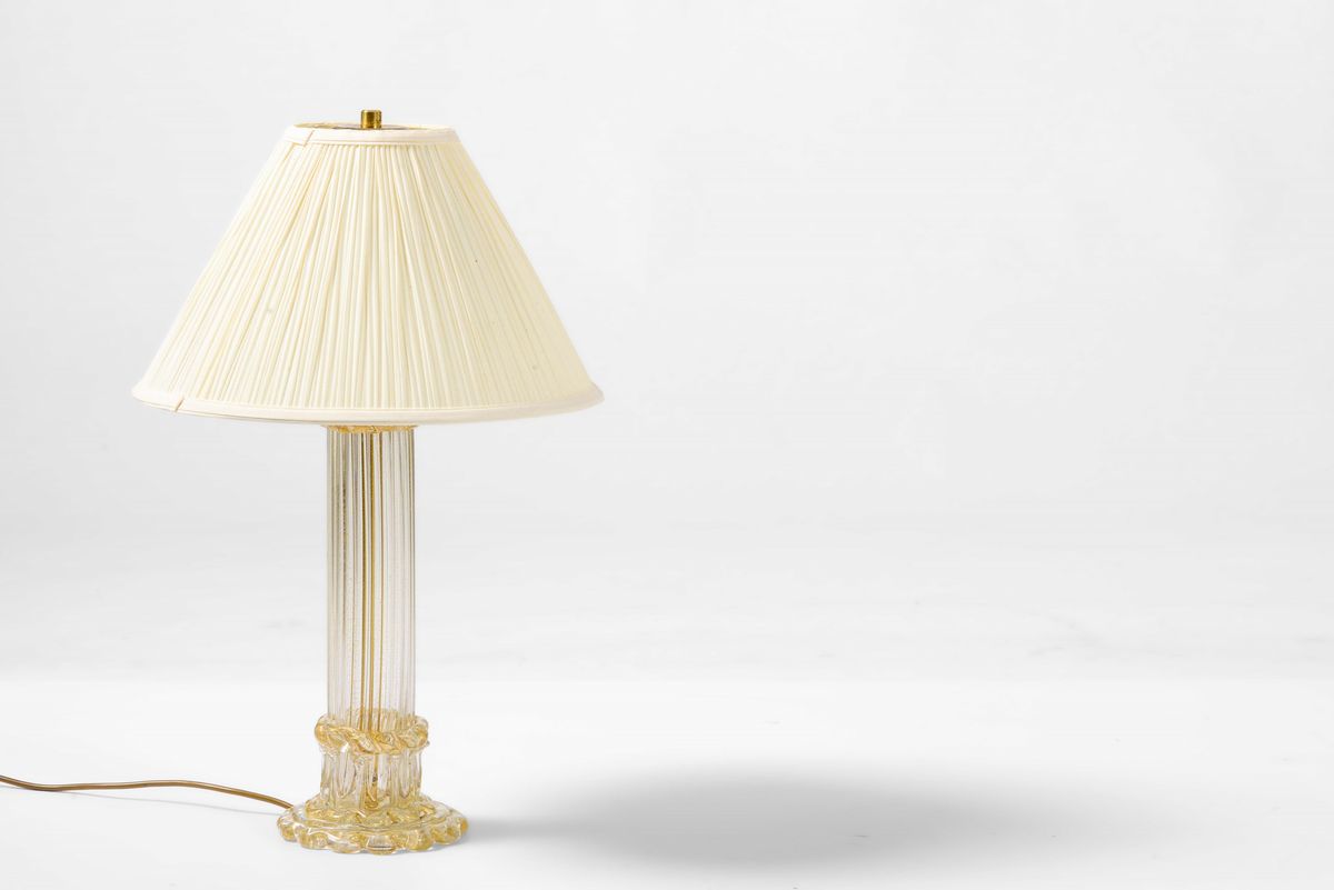 Lampada da tavolo della serie Colonna mod. 9054 in vetro di Murano e inclusioni in oro. Paralume in tessuto.