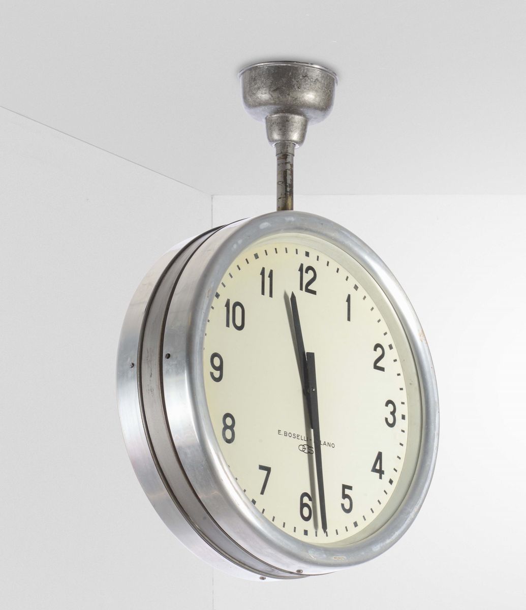 Orologio bifacciale con supporto da soffitto, particolari in alluminio.