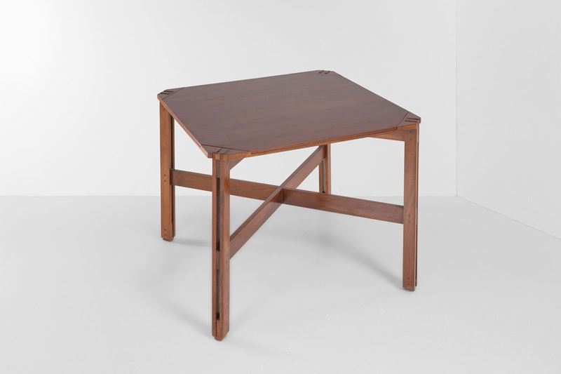 Tavolo mod. 753 con struttura, piano e sostegni in legno.
