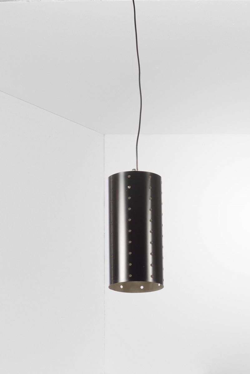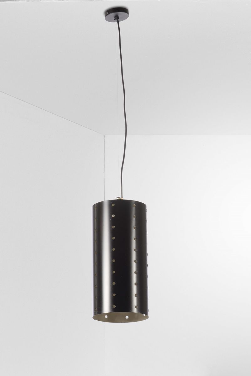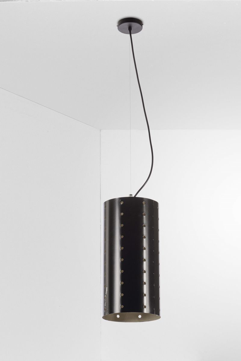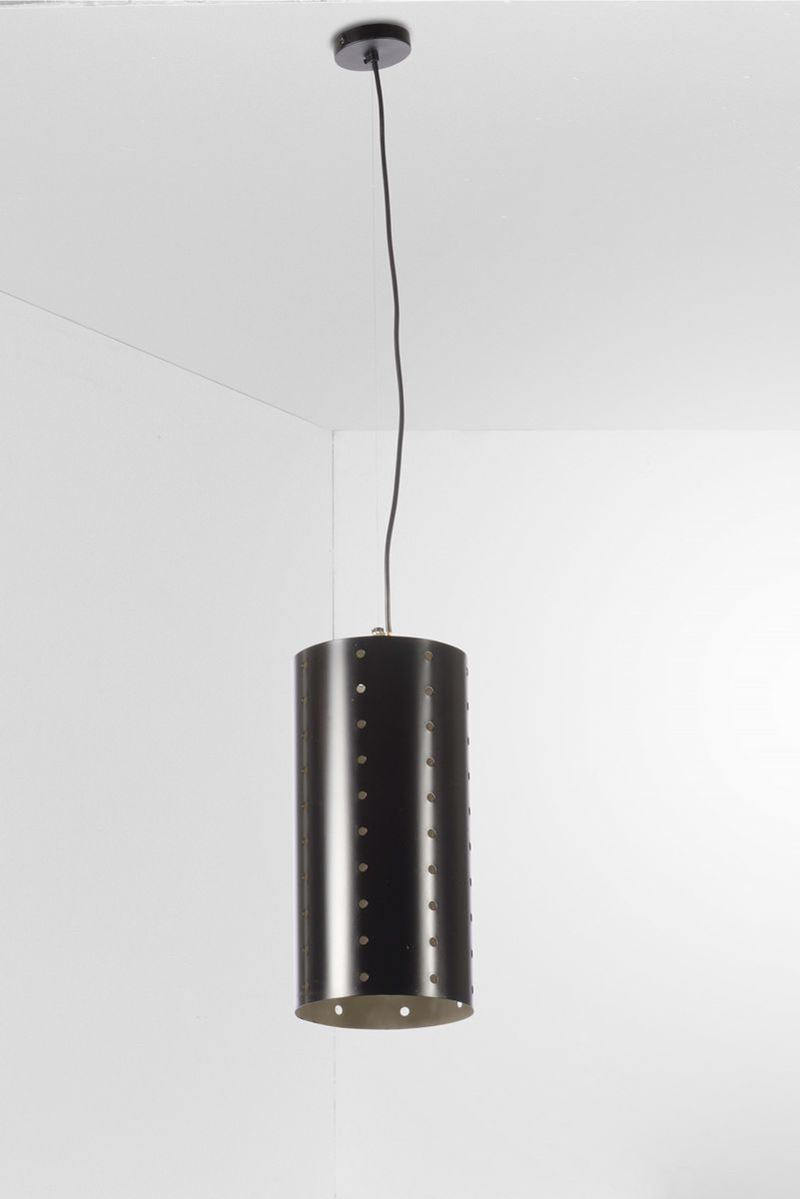 Quattro lampade a sospensione ad altezza regolabile con diffusore in metallo laccato traforato.