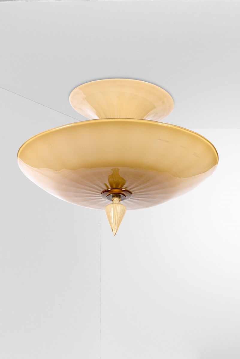 Lampada a plafone con struttura in metallo e vetro di Murano lattimo.