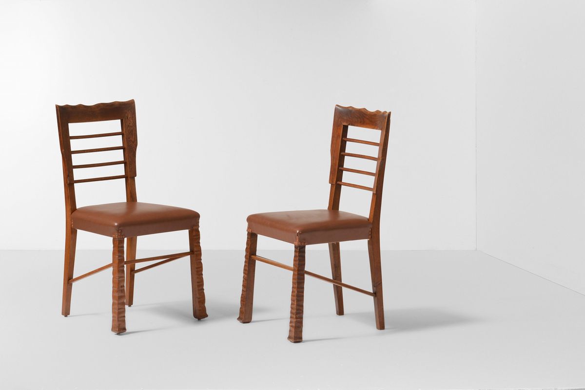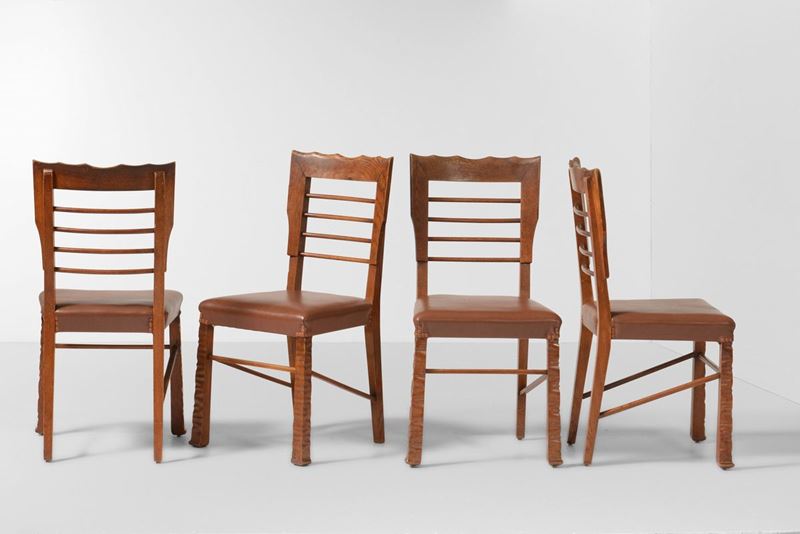 Set di dieci sedie. Struttura e sostegni in legno con rivestimento in pelle.