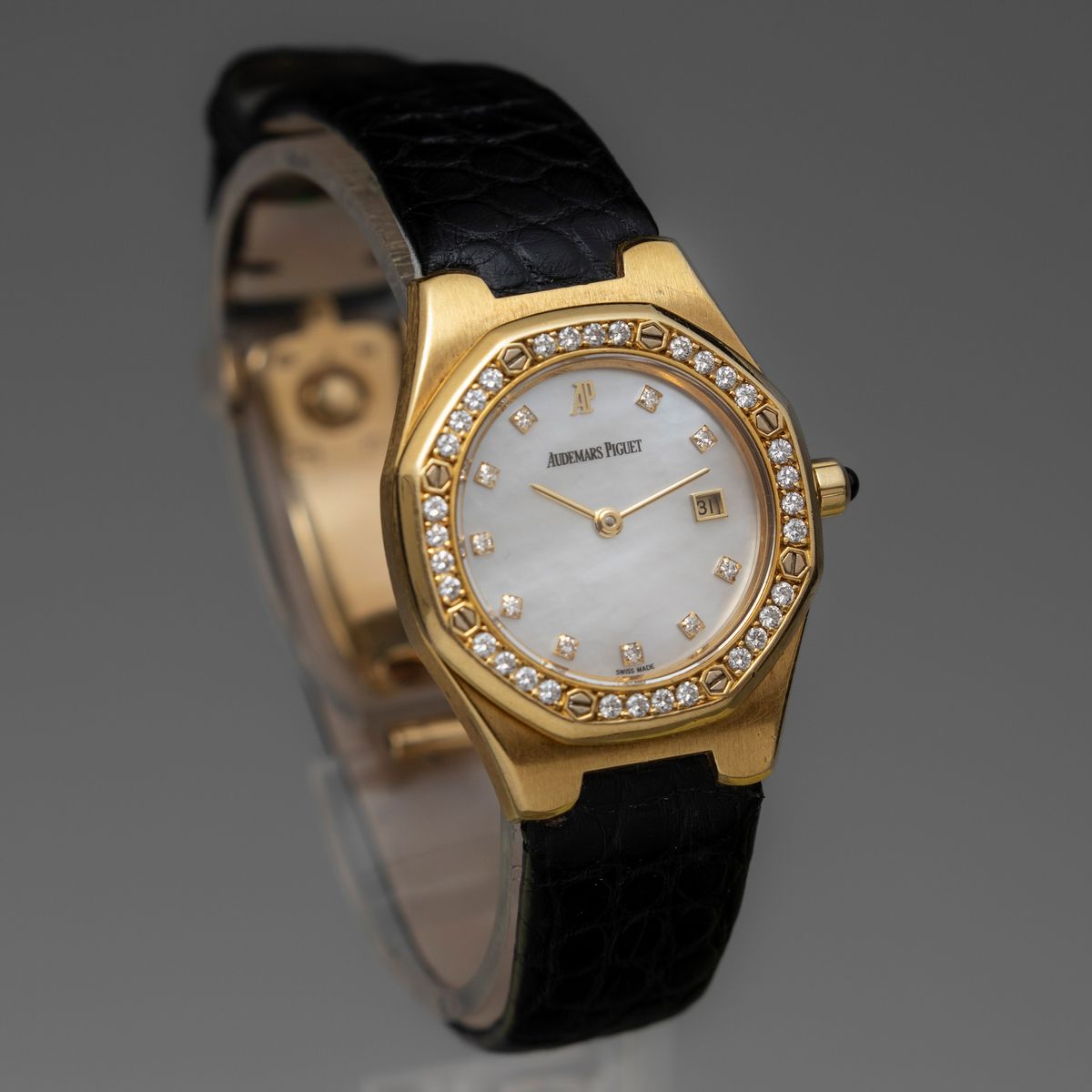 AUDEMARS PIGUET - Royal Oak in oro 18k con cinturino in pelle, quadrante in madreperla con brillanti. Chiusura deployant, [..]