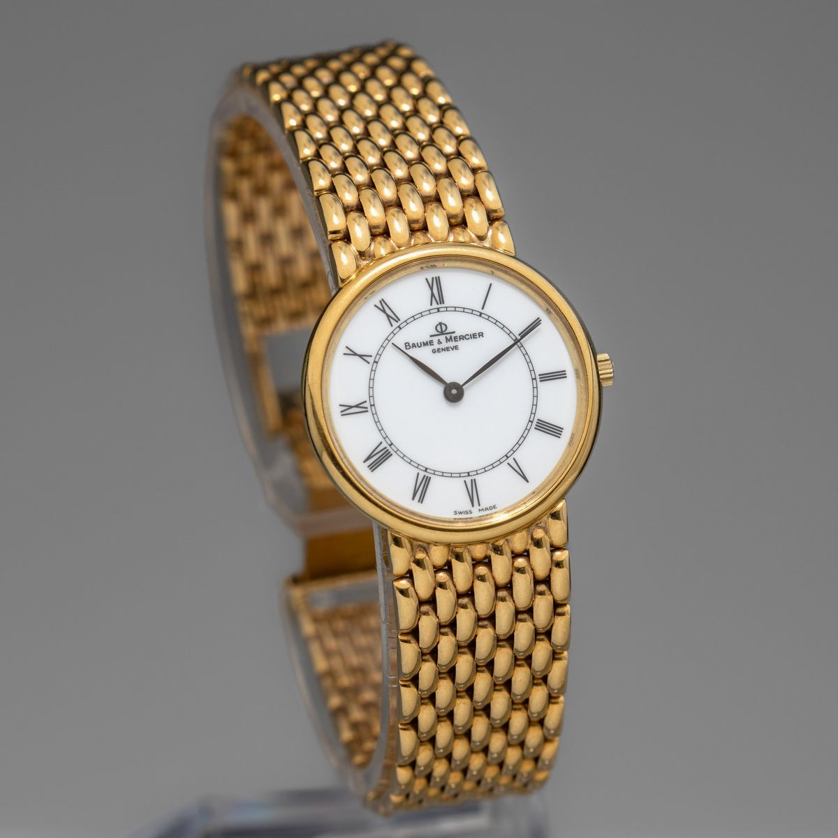 BAUME & MERCIER - Elegante orologio da donna in oro 18k con bracciale integrato, quadrante bianco con numeri Romani