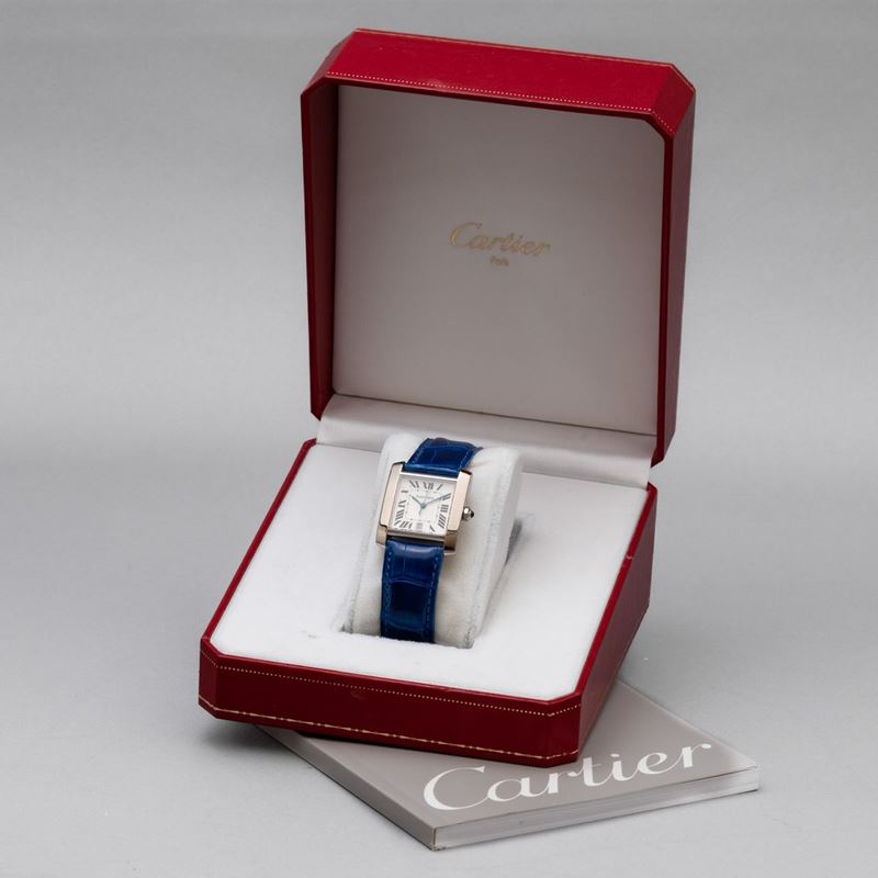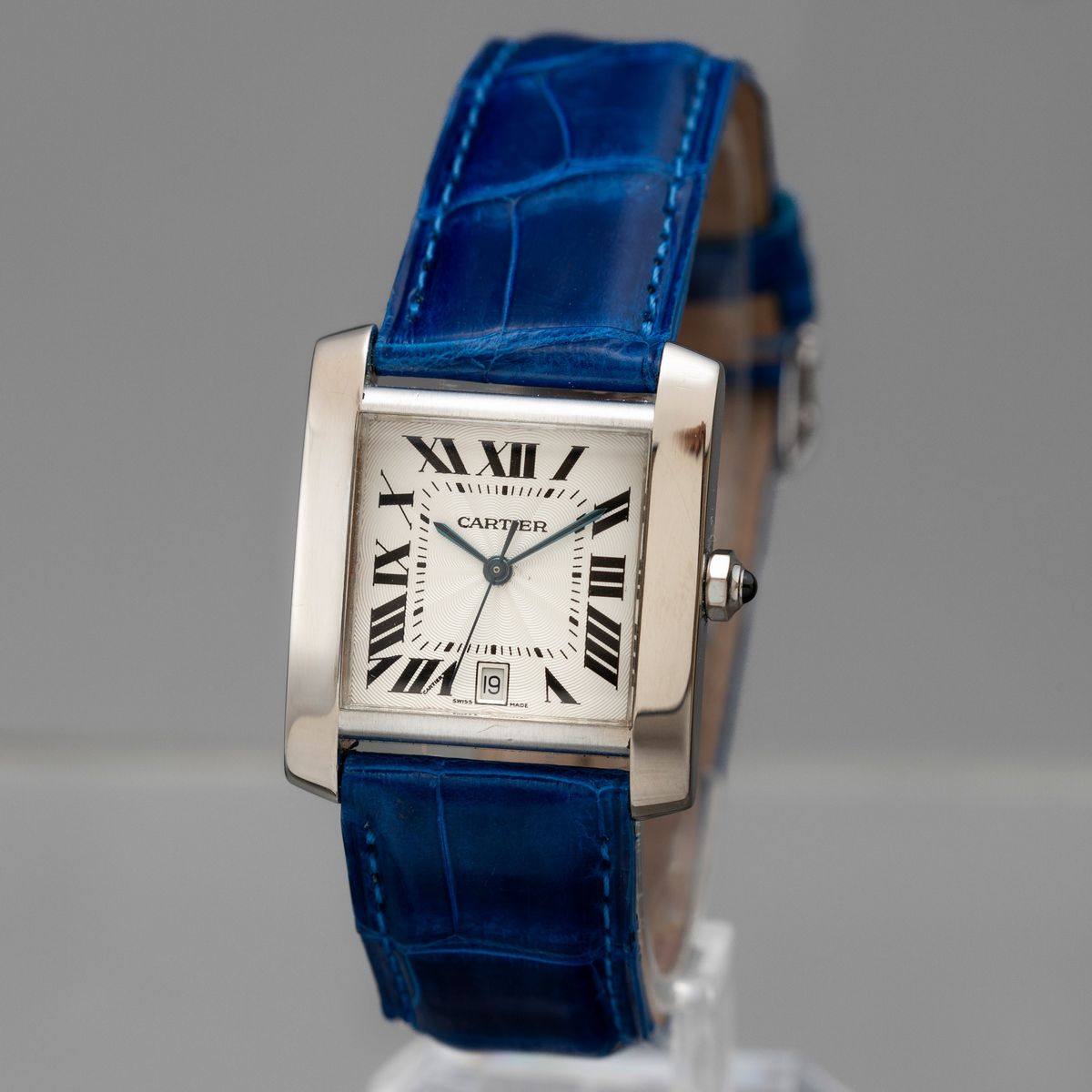 CARTIER - Elegante Tank Francaise automatico in oro bianco 18k con datario, quadrante numeri Romani. Accompagnato da astuccio [..]