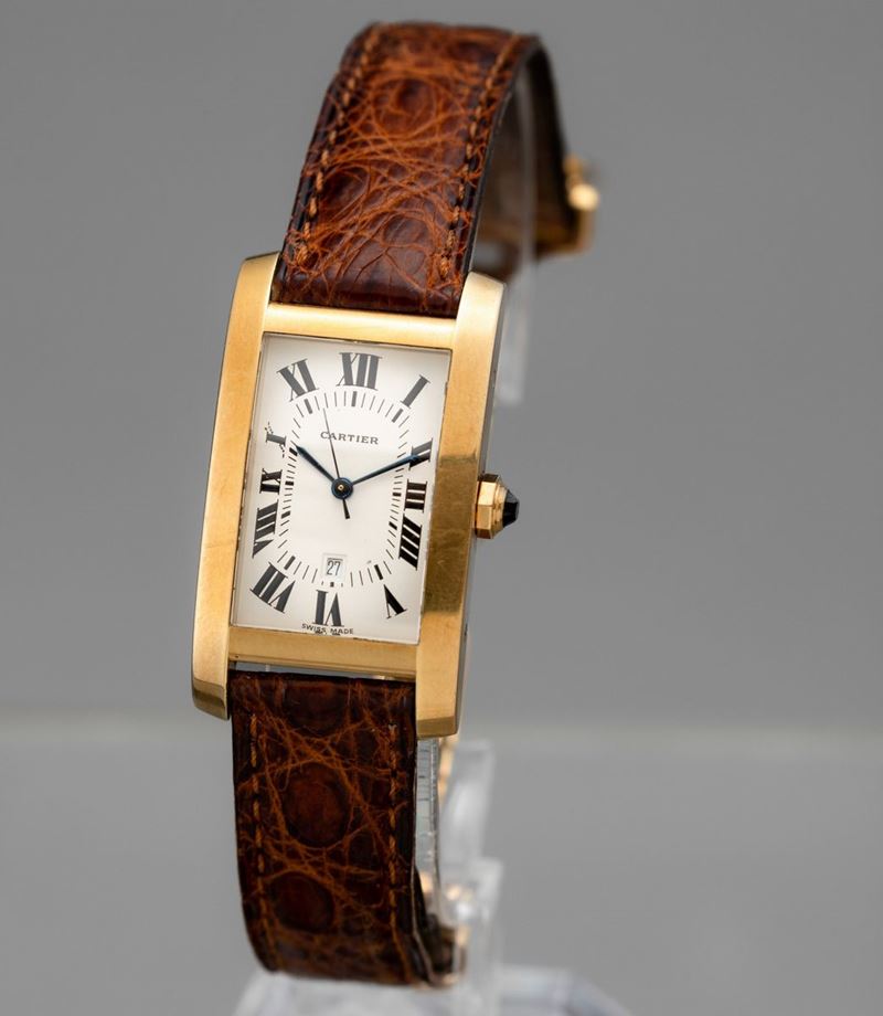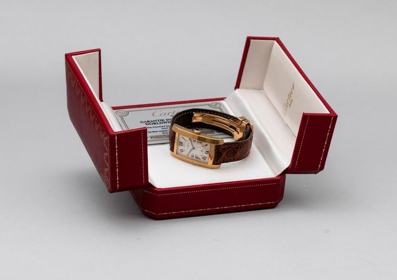 CARTIER - Tank Americaine automatico con datario, cassa in oro giallo 18k, numeri Romani e deployante. Accompagnato da astuccio [..]