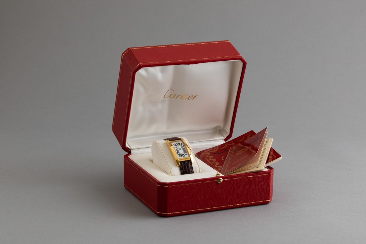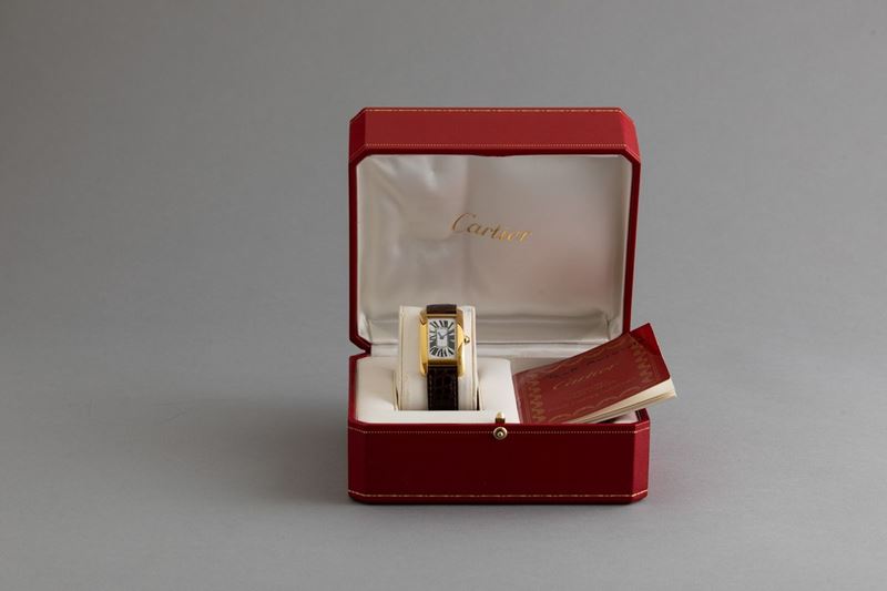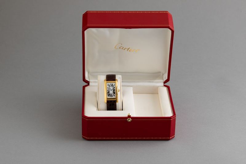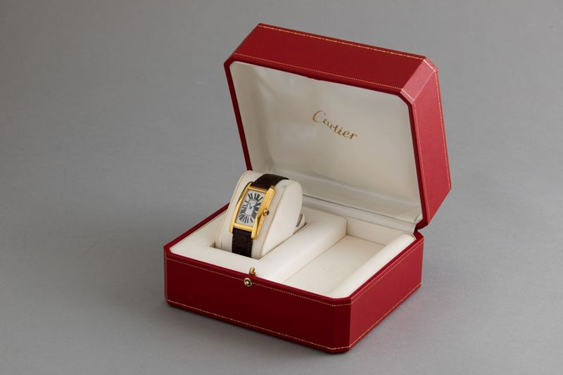 CARTIER - Tank Americaine in oro 18k con quadrante bianco e numeri Romani, movimento al quarzo. Accompagnato da astuccio [..]