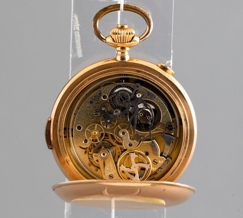 Cronografo da tasca savonnette in oro 18k, con calendario completo, fasi di luna, e ripetizione ore quarti e minuti.
