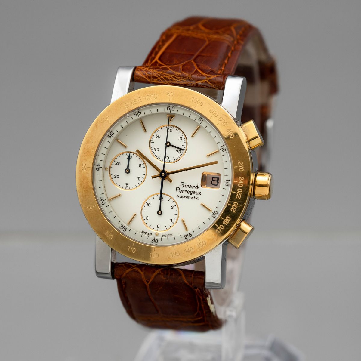 GIRARD PERREGAUX - Cronografo automatico acciaio e oro, contatori verticali con datario e lunetta tachimetrica