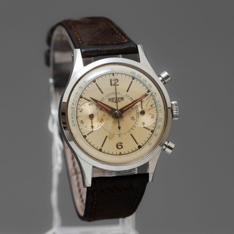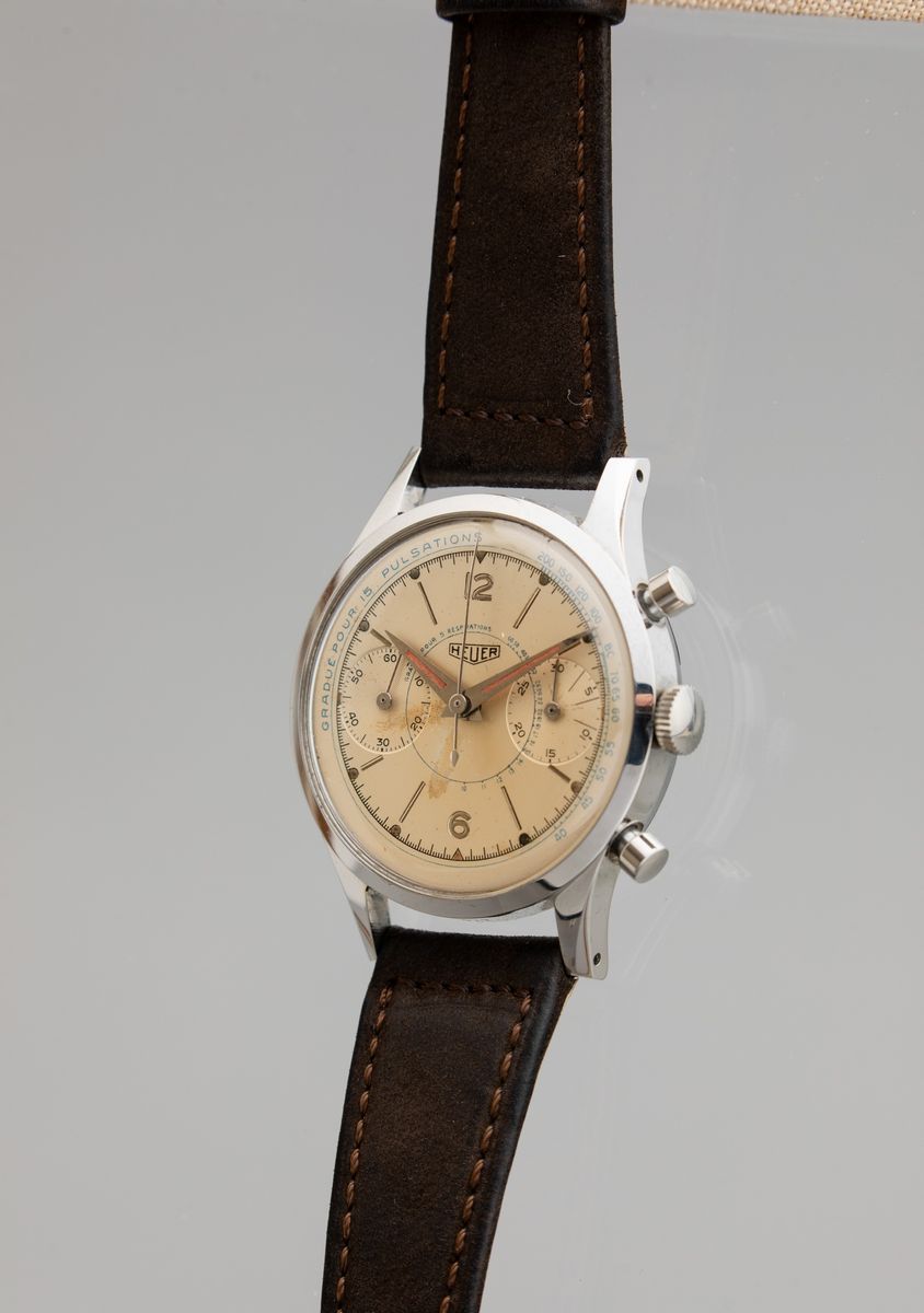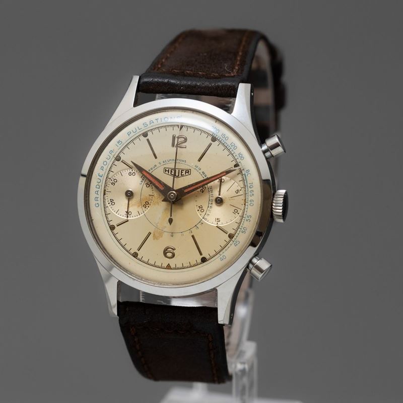 HEUER - Pre-Carrera ref 3336, Raro cronografo due contatori con cassa in acciaio oversize, fondello a vite e quadrante con numeri in bassorilievo, scala pulsometrica interna e sfere al radio.